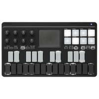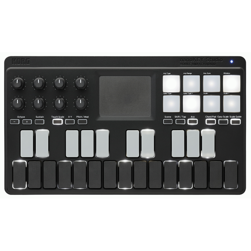 An all-in-one that delivers inspiration. A mobile MIDI keyboard that connects via USB or wirelessly. The nanoKEY Studio provides a keyboard, knobs, trigger pads, and touch pad that lets you instantly convert your inspiration into sound. It is battery ope