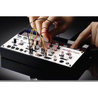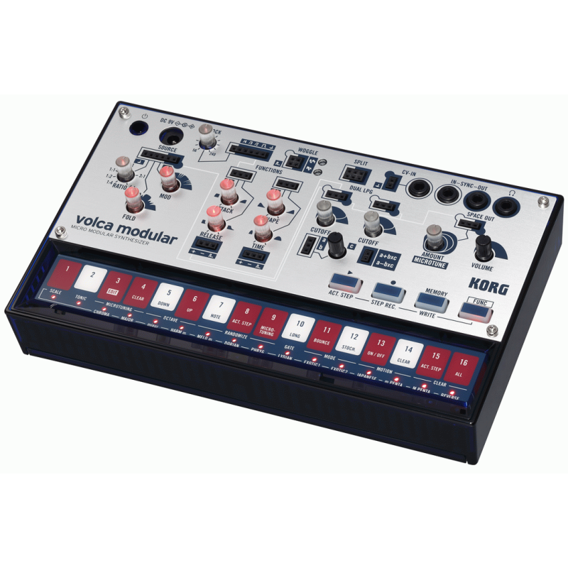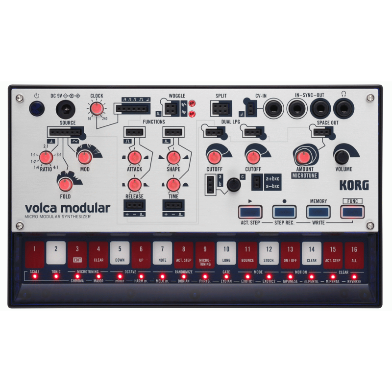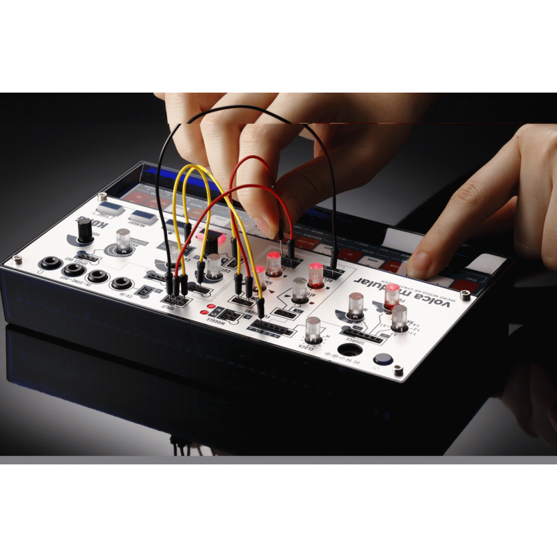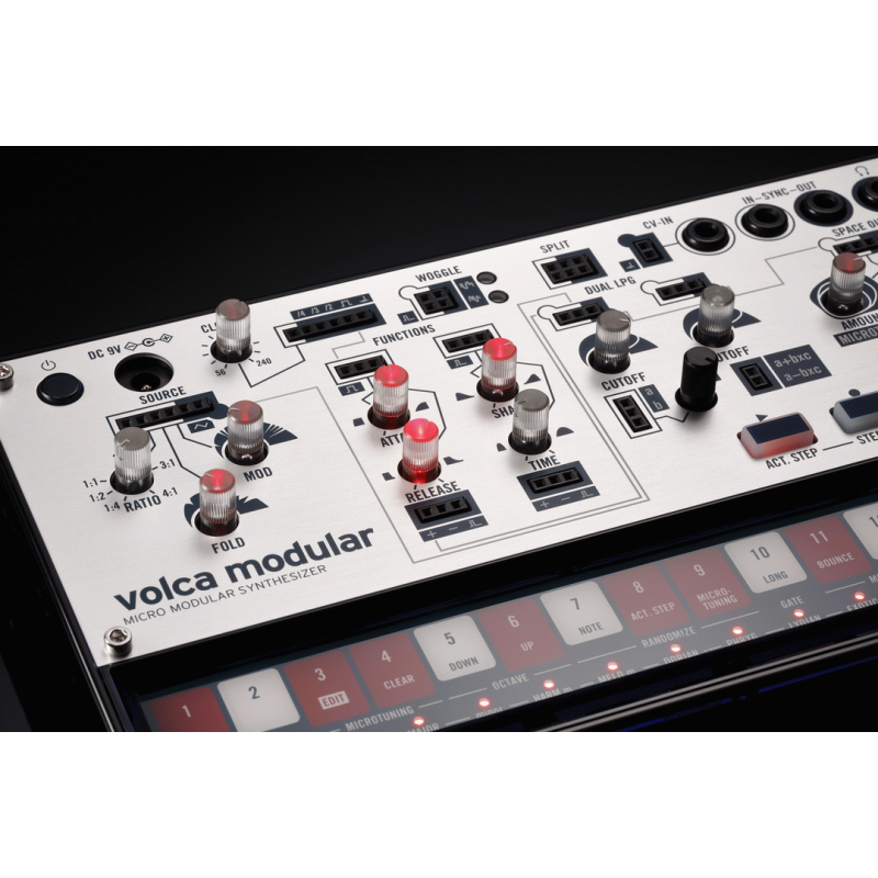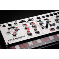Creating new sounds that don’t exist in the outside world is an unending dream which has continued since the birth of electronic musical instruments.This dream has evolved and expanded throughout the development of new and unique music production devices. The popularity of modular synthesizers around the world has generated new excitement and interest in the so-called West Coast style of synthesis that deviates from traditional synthesis norms. The compact body of this volca synth features eight modules and 50 patch points. While learning the basics of a modular synth, you can use popular features of the volca synthesizer line to control a unique and different flavor of analog sounds. Eight modules: The volca modularis a semi-modular synthesizer consisting of independent analog synth modules, digital effects, and a sequencer. Each of the modules has been carefully selected for its stand-alone completeness. The modules are internally connected so that sound can be produced even before connecting the included pin cables, and the routing is shown by white lines on the panel. Module connections via a pin cable take priority over the internal connections, bypassing them. SOURCE:This consists of a triangle VCO carrier and a modulator. The complex overtones generated by FM modulation are sent through a wave foldercircuit to add additional overtones, producing a distinctive sound. This module is important in determining the basic characterof the soundof volca modular. FUNCTIONS:This section consists of two function (envelope) generators. In addition to an ADH generator with attack, hold, and release, there's a Rise-Fall generator,also known as a slope generator, whichnot only appliestime-varying change to the sound but also lets you patch the end trigger out back into the trigger in as a loop, making it usable as a VCO or LFO. WOGGLE:This is a random signal generator containing a sample & hold circuit that uses pink noise as its source. Two outputsare provided, allowing it to output either stepped or smooth random noise.SPLIT:This module distributes oneinput to two outputs. It can also be used in the reverse direction, combining two control or audio signals into one. DUAL LPG:This consists of two low-pass gate circuits. Typical of the West Coast style of synthesis, the module packages a filter with anamp, allowing the brightness and volume of the sound to vary together.UTILITY:This is a mixing scaling module that combines two signals in variousways. It can mix not only audio signals but also control signals, as well as inverting or attenuating those signals. SPACE OUT:This is a stereo module that applies a reverb-like effectto the audio signal. SEQUENCE:This module is for connecting to the internal sequencer. You can set the tempo, and select different rhythm divisions tooutput via the gate counter