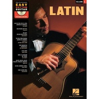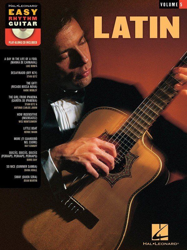 The songs in the Hal Leonard Easy Rhythm Guitar books are presented withlarge, easy-to-read Rhythm Tab notation. The rhythm guitar part, or acc ompaniment, is carefully arranged for beginning to intermediate players.Chord frames are provided to help the player with left-hand fingerings. Lyrics and a melody cue are also included. Just listen to the CD to hea r how the guitar should sound, and then play along using the separate backing tracks. The audio CD works on any CD player, and is also enhanced so PC and Mac users can adjust the recording to any tempo without changing pitch! This pack lets you play the chords and riffs of 10 Latin classics: A Day in the Life of a Fool (Manha De Carnaval) Desafinado (Off Key) The Gift! (Recado Bossa Nova) The Girl from Ipanema How Insensitive (Insensatez) Little Boat More (Ti Guarder Nel Cuore) Quizs, Quizs, Quizs (Perhaps, Perhaps, Perhaps) So Nice (Summer Samba) Sway (Quien Sera). Latin Publisher: Hal Leonard Instrument: Guitar Format: Guitar TAB Pages: 40 Series: Easy Rhythm Guitar