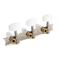 Economical classical machine head set. 3-a-side mounted on nickel-plated plate. Ivory coloured buttons. 10mm bone coloured rollers. 35mm spacing. Gear ratio 1:15. Made in Netherlands.
