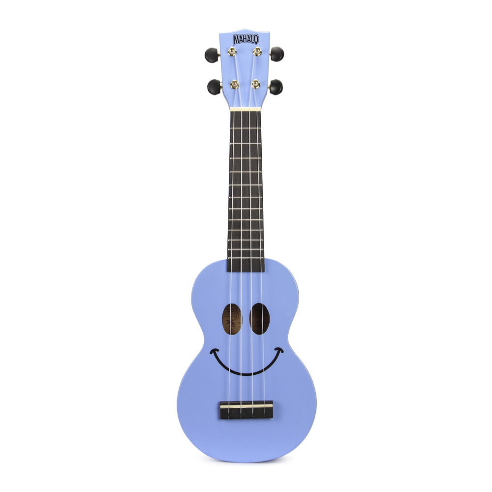 MAHALO U60SMLBUSOPRANO UKULELE LIGHT BLUE. This is a Standard (Soprano) Ukulele with a Maple body and Nato neck. Smiley Face Design C/W Bag.