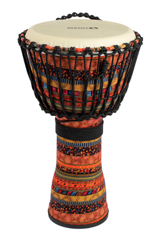 Mano Percussion MPC07 10” Rope Tuned Djembe. MANO PERCUSSION – 10” wrench tunable djembe. ABS shell. 6 tunable hook lugs. Lightweight cloth wrapped ABS shell. Rubber base strip for extra protection. Includes bag with backpack straps and tuning wrench. Harmony finish.