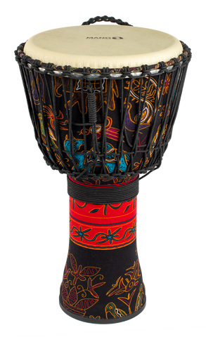 Mano Percussion Rope Tunable Djembe Cloth Passion Flower The Mano Percussion 12" Rope Djembe With Bag - Passion Flower is 12" rope tunable djembe with ABS shell, that stands 23¾" high. FEATURES Lightweight cloth wrapped ABS shell. Rubber base strip for extra protection. Includes bag with backpack straps. Rope handle. Passion Flower finish.