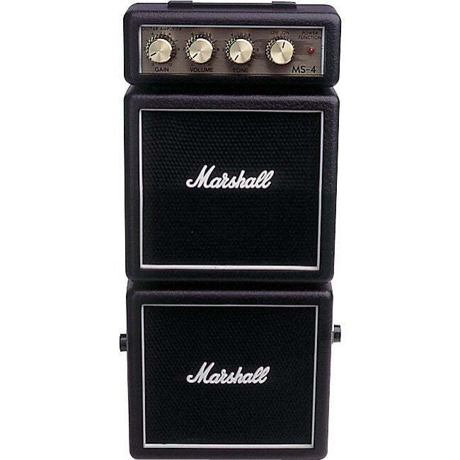 The MS-4 is the ultimate in portable amplifiers. Battery/mains adapter operated micro amps, packing a full 1 Watt of Marshall tone into a tiny case. This mighty micro Marshall half-stack has switchable Clean and Overdrive modes. A single Tone control provides full focus of bass to treble. The MS-4 has a headphone output for those of you who want to rock in private. This output can also be used to effectively drive an external power amp. The MS-4 is finished in traditional Marshall black, with white logo and gold panel.