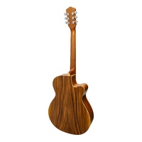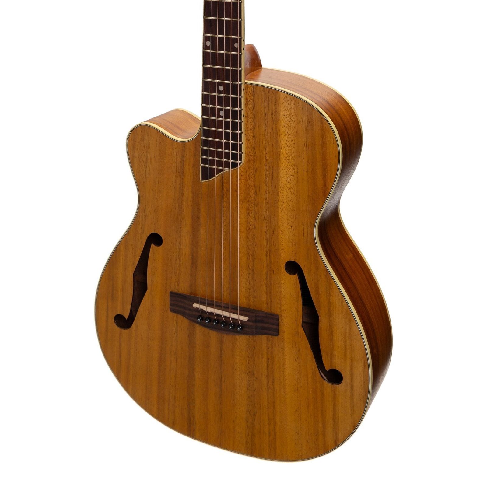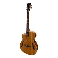 With elegant archtop styling coupled with traditional flat top design, the Martinez MJH-3CL-KOA Jazz Hybrid Guitar is not your everyday acoustic, providing the best of both worlds with its head turning good looks and full bodied acoustic tone. The Jazz Hybrid is an ideal choice for the aficionado and enthusiast alike, offering easy playability and warm tone, within a vintage-styled package. BRAND: MARTINEZ MODEL: MJH-3CL-KOA INSTRUMENT: ACOUSTIC GUITAR SHAPE: SMALL BODY GUITAR COLOUR: NATURAL DEXTERITY: LEFT STRINGS: 6 STRING TYPE: LONG LIFE PHOSPHOR BRONZE WEIGHT: 1.75KG TOP: LAMINATE KOA BACK / SIDES: LAMINATE KOA NECK: MAHOGANY FINGERBOARD: ROSEWOOD BRIDGE: ROSEWOOD BRIDGE SADDLE: 75mm SCALE LENGTH: 25.5" NUT WIDTH: 42mm MACHINE HEADS: MARTINEZ PICKUP SYSTEM: NONE BUILT-IN TUNER: NO FRETS: 22 WARRANTY: 1 YEAR INCLUDES CASE: NO LENGTH: 1045mm DEPTH: 100mm UPPER BOUT: 280mm WAIST: 240mm LOWER BOUT: 390mm