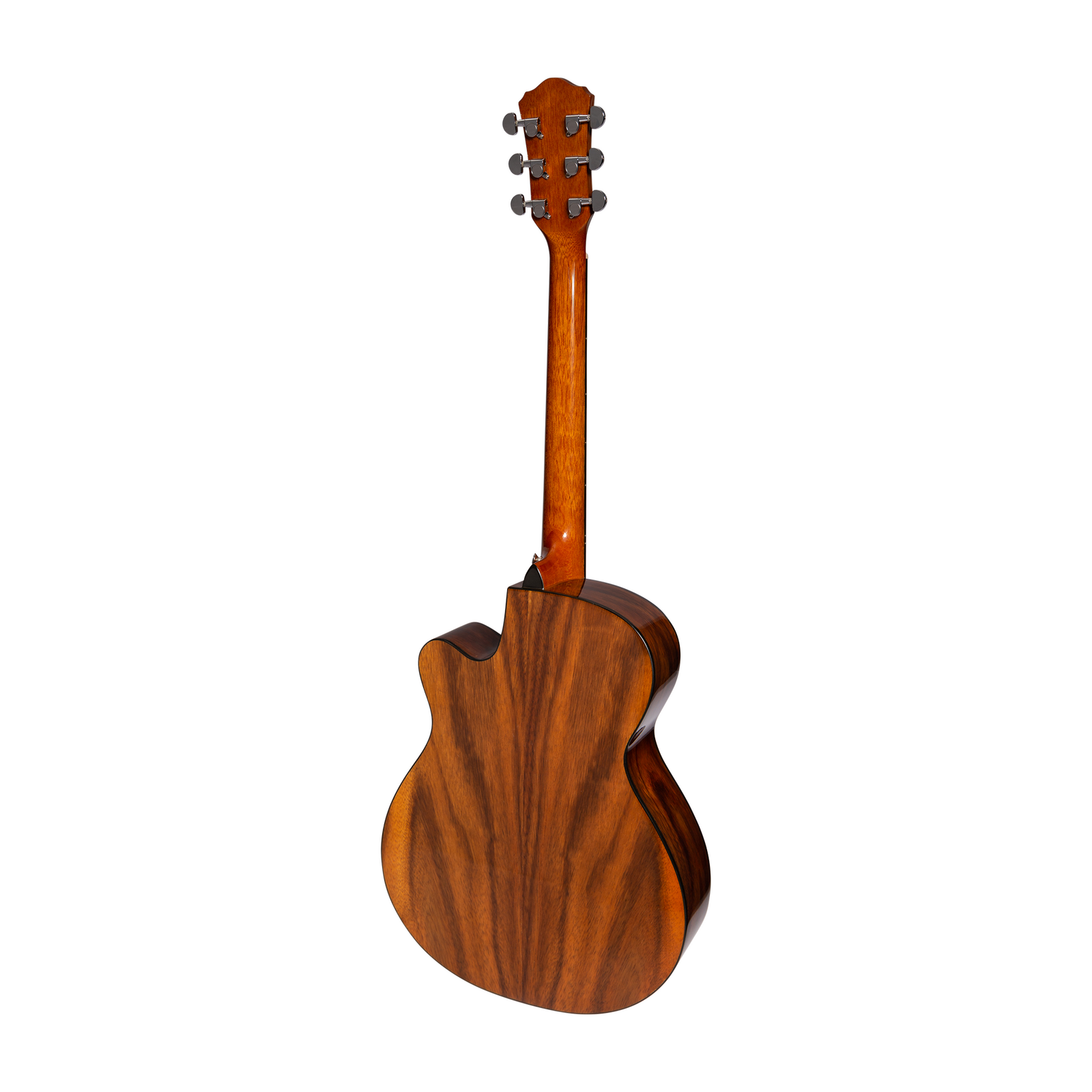 With elegant archtop styling coupled with traditional flat top design, the Martinez MJH-3CPG-RWD Jazz Hybrid Guitar is not your everyday acoustic, providing the best of both worlds with its head turning good looks and full bodied acoustic tone. The Jazz H