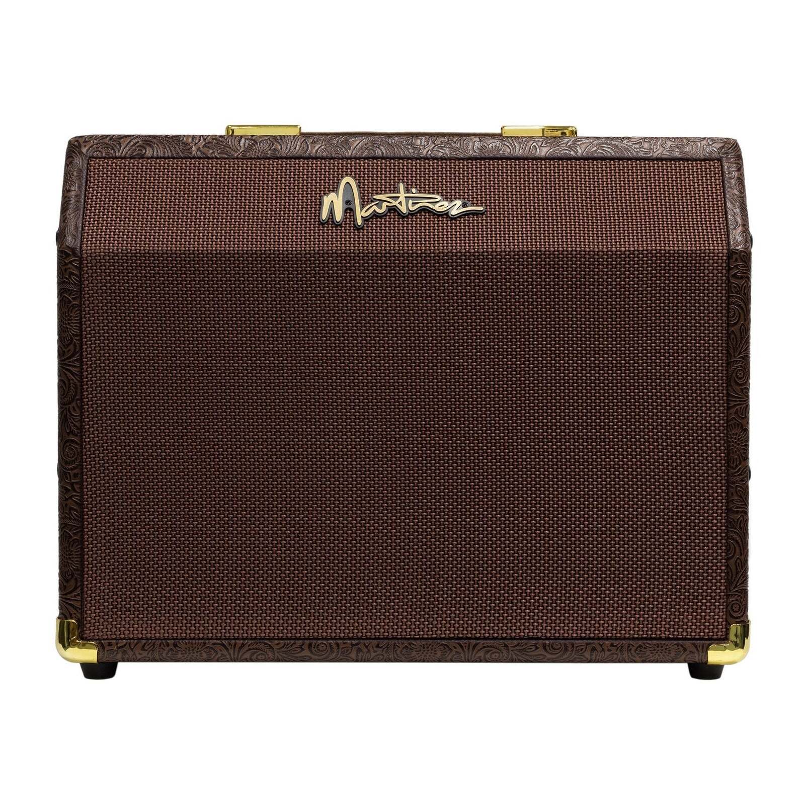 The Martinez MAE-25R-FEV Retro-Style Acoustic Guitar Amplifier with Reverb packs a punch, pushing out a solid 25 watts of power. Beautifully presented in a paisley brown finish and set off with vintage style checked speaker grill, this amp is packed with features: 25 Watt RMS. Mic Channel with XLR input with Gain Control. Guitar Channel with Input, Gain Control and 4-band EQ. Master Reverb. Line Out. Headphones Socket. CD Input with Volume Control. 20cm (8”) Heavy Duty Speaker and Piezo HF Horn.