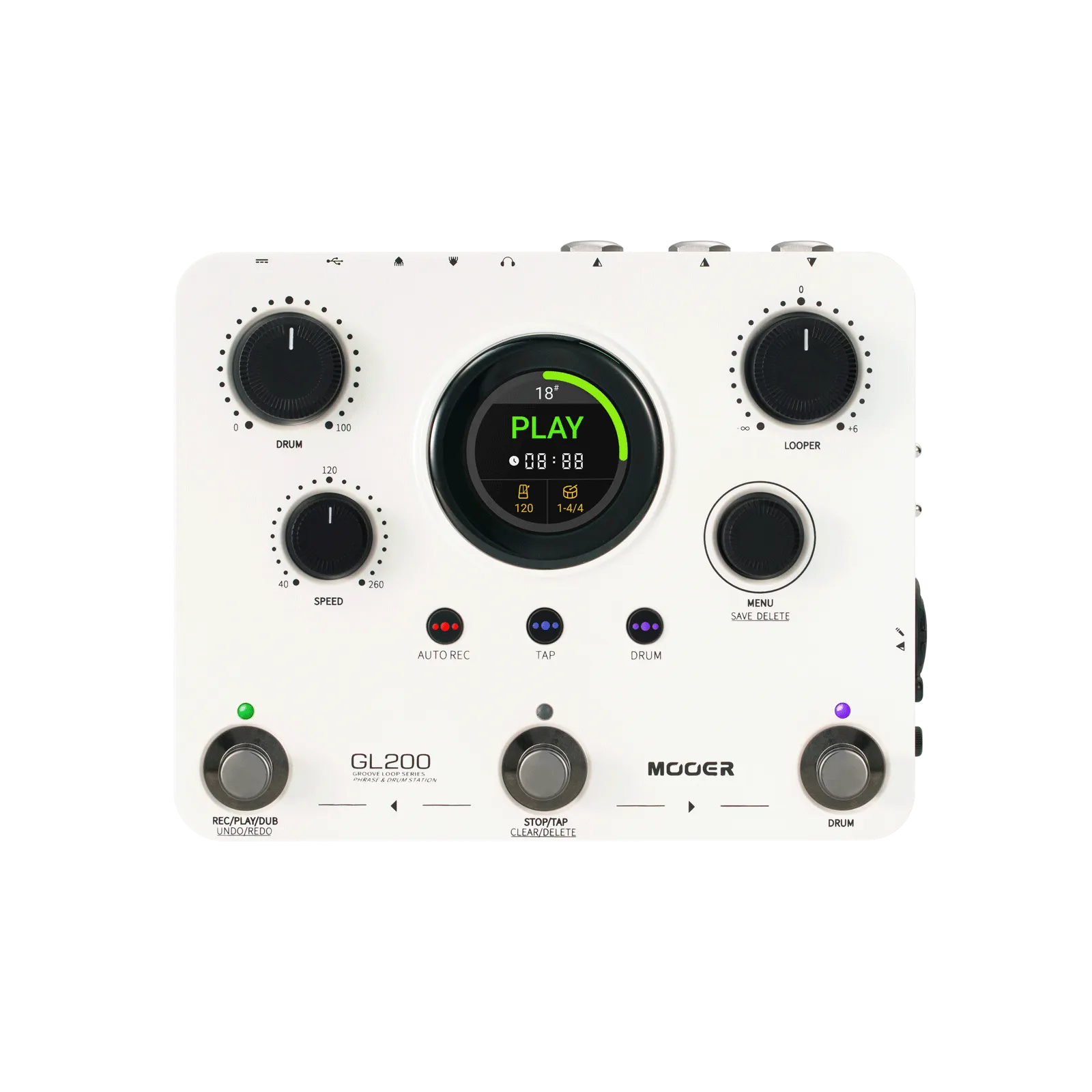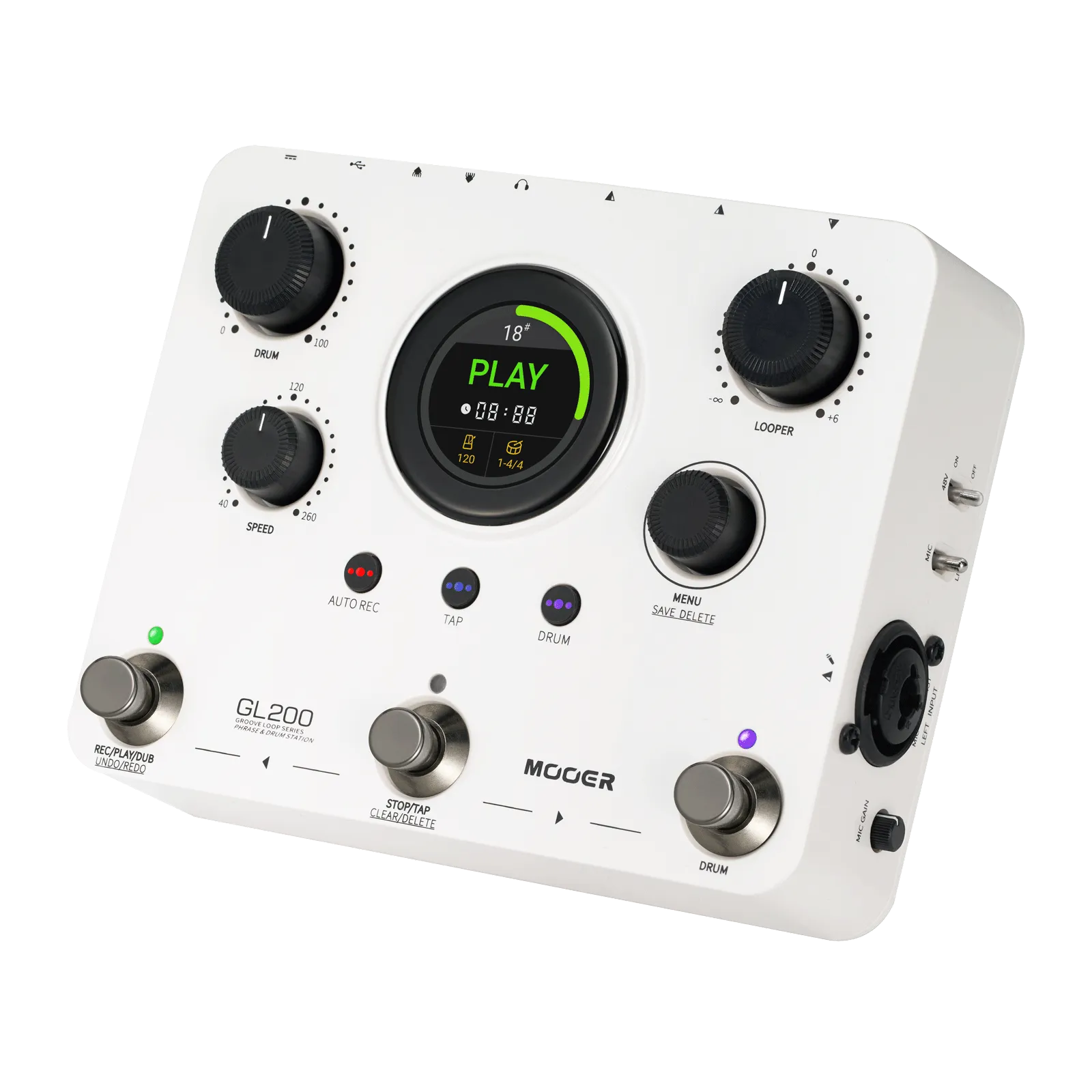 Building on MOOER’s popular loop pedal range, the MEP-GL200 is a compact stereo looper and drum machine designed for modern players. Whether you’re gigging, recording, or practising at home, it delivers a powerful, all-in-one solution without taking up much pedalboard space. With up to 800 minutes of loop time across 100 memory slots, the GL200 makes it easy to build layered arrangements, store full setlists, and switch between parts on the fly. Recording and overdubbing is quick and intuitive, so you can stay focused on playing. The onboard drum machine includes a wide range of rhythms, plus the option to import your own kits and MIDI patterns. MOOER’s DrumMatch AI automatically matches grooves to your playing, giving you natural-sounding backing without the need to stop and adjust settings. Flexible connectivity makes it easy to integrate into any setup. Dual TRS MIDI I/O allows sync with external gear, while Bluetooth audio lets you stream backing tracks directly from your phone or tablet — perfect for practice or casual jams. A combo XLR/¼” input with phantom power supports microphones as well as instruments, making the GL200 a great choice for singer-songwriters and solo performers. There’s also a dedicated headphone output for silent practice. Simple to use and packed with features, the GL200 is a versatile looping workstation that’s ready for stage, studio, or home use. Key Features Stereo looper with built-in drum machine Up to 800 minutes recording time, 100 memory slots DrumMatch AI groove matching Import custom drum kits and MIDI patterns Dual TRS MIDI I/O Bluetooth audio streaming XLR/¼” combo input with phantom power Headphone output for silent practice Easy-to-use touchscreen interface