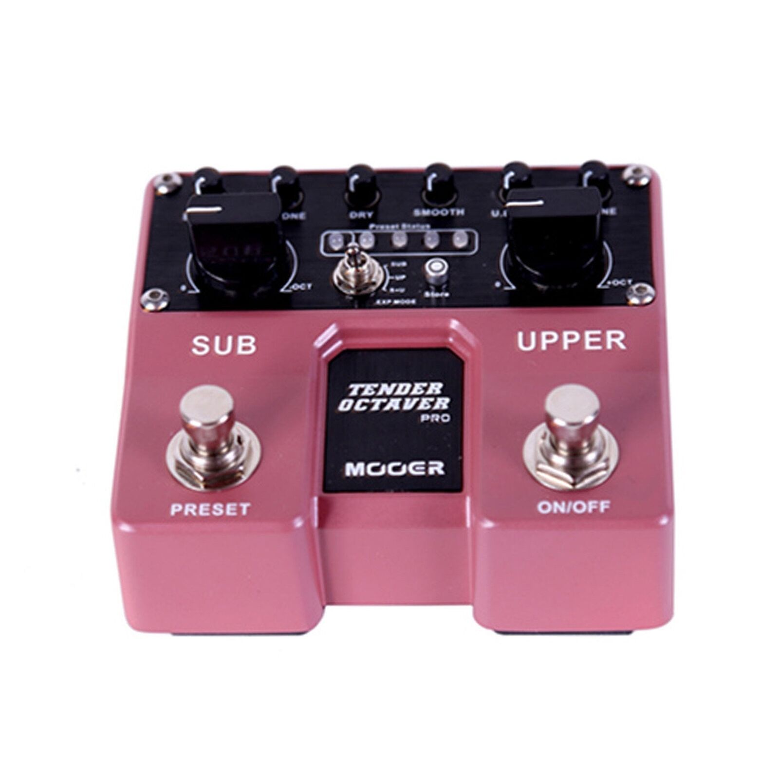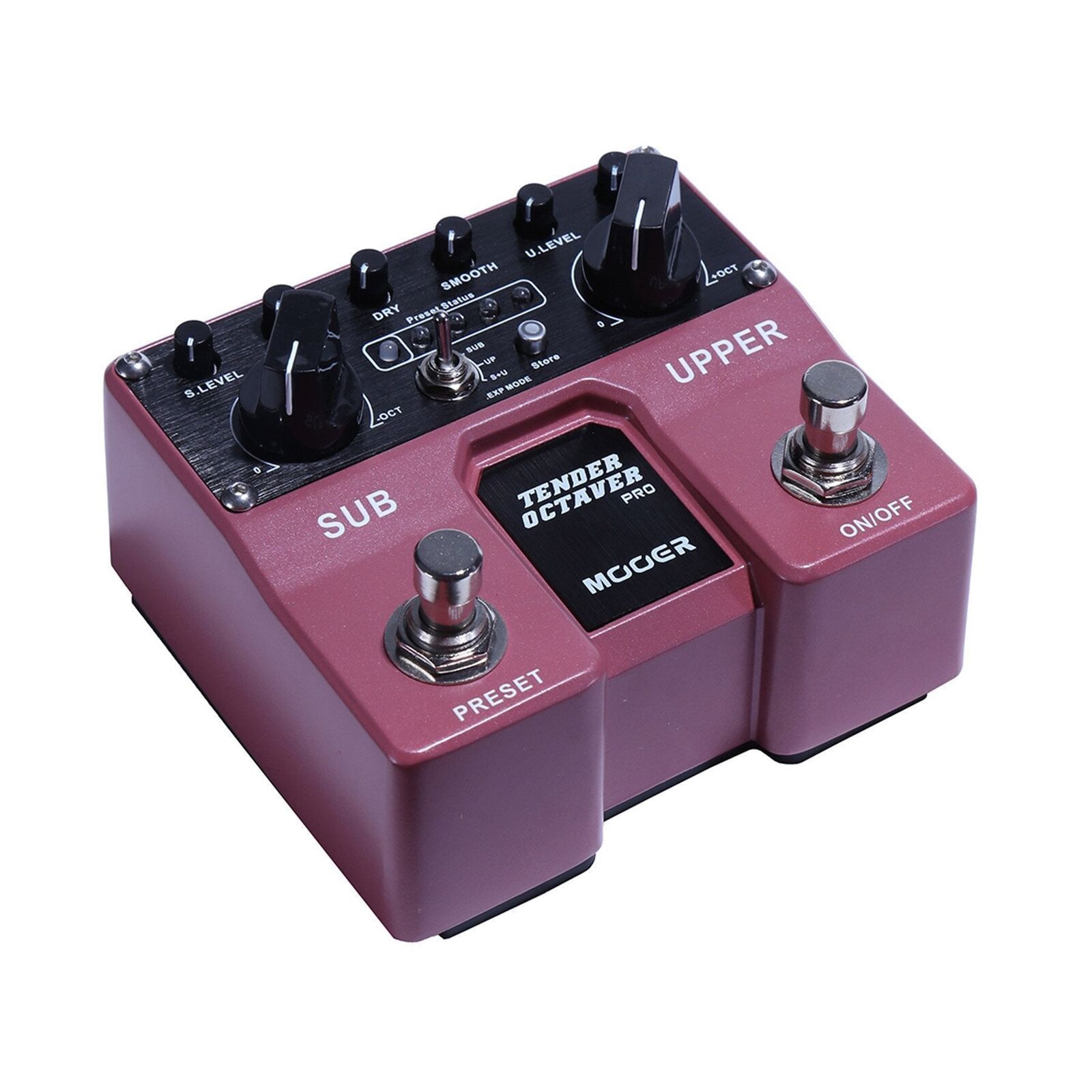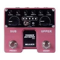 The Mooer MEP-TOPRO Tender Octaver Pro is a compact dual effects pedal that expands on the micro version, bringing together a whole host of cool new features and options with very easy to use controls. With added features, the Tender Octaver Pro becomes much more than just an octave pedal, making it possible to do harmonization, pitch shifting, wammy and detune chorus effects. Just like its micro counterpart, the dry, sub and upper voices each have their own dedicated, independent level controls. However, the Tender Octaver Pro also includes individual tone and pitch controls for Sub and Upper, giving a lot more customization options for shaping your sounds. The Pitch controls are infinitely adjustable between unison and +1/-1 octave, making it possible to create all kinds of interesting harmonies and special effects. Connecting a standard expression pedal to the Tender Octaver Pro expands on this and opens up the possibility of real time pitch shifting. As if this wasn't enough, the pedal also has a smooth control for automatic ambient volume swells. All of this fits into a twin series pedal with stereo outputs and 4 storeable user presets which can be easily scrolled through live using the dedicated footswitch. Features: Separate volume, tone and pitch controls for both sub and upper octaves Store and recall up to 4 user presets DRY: Adjusts output volume of the dry guitar signal SMOOTH: Ccontrol for automatic volume swells PRESET FOOTSWITCH: Press this footswitch to change the selected preset (Left most LED is Pedal mode in which all parameter values are depicted by the pedal controls) STORE: Used for saving presets EXP MODE: Depicts which voices the expression pedal will effect External connection for expression pedal to control octave pitches Stereo outputs and Setup Rugged full metal casing and quality switching in a small and exquisite design. Input: 1/4" mono jack (impedance 1M Ohms) Output: 1/4" mono jack x2 (impedance 100 Ohms) Sampling rate: 44.1K Sampling accuracy: 24bit Dimensions (HxWxD): 106 x 96 x 53 mm Weight: 400g DC 9V Centre Negative Power Supply (sold separately)