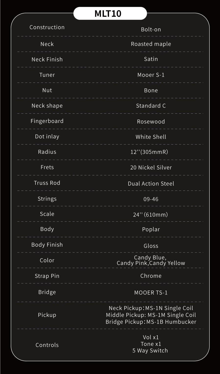The MLT10 is an Offset body style guitar that has been meticulously crafted to suit beginners and experienced guitarists on a budget. In particular, it stands out among MOOER’s brand for its focus on being lightweight and stylish, while still meeting the exceptional craftsmanship standards of its past creations. Similarly to several guitars from the MSC1+ Pro range, the MLT10 features a roasted maple neck and satin finish, ensuring that the guitar’s playability is as smooth as possible. While it sticks to MOOER’s usual standard C-shaped neck, the design has been customized slightly to include a 24-inch scale length, which is 1.5” shorter than the MSC1+ Pro series, enhancing the playability and fret comfort for newer players. Furthermore, GGW has chosen rosewood for the fingerboard for softer fingering while lining it with white shell dot inlays and 20 nickel silver frets, overall putting more emphasis on accessible chord playing, while still providing plenty of room for lead guitar runs. Another similarity between the MLT10 and the MSC1+ Pro series is the guitar’s poplar body and gloss finish, resulting in a lightweight design but without compromising when it comes to resonance. However, the overall tonal properties are slightly different, primarily due to the adjustment of pickups, this time powered by an MS-1N single-coil in the neck position, an MS-1M single-coil in the middle, and the MS-1B humbucker in the bridge. As always, the guitar features a five-way pickup selector switch and a tone control dial, enabling players to explore a range of tones suitable for various musical styles. Despite being purely cosmetic, one of the most notable features of the MLT10 is the vibrant palette that it comes in, with all of the glossy finishes being in pastel colors of Candy Blue, Candy Pink, and Candy Yellow. Ultimately, these striking colors make the MLT10 a statement piece for performers who want to bring a more light-hearted aesthetic to their band or solo performances. When it comes to the MLT10’s structure, the guitar is manufactured with classic bolt-on construction and dual-action steel truss rod, keeping things affordable but tonally consistent. Uniquely, MOOER S-1 tuners and a TS-1 bridge are also fitted, further ensuring stable tuning and precise intonation while keeping things simple. Of course, a chrome strap pin and volume control dial is also fitted to the guitar, guaranteeing that dynamic performances are always on the cards for MLT10 users. Overall, MOOER is going for a more lightweight, beginner-friendly, and affordable approach with the MLT10, a trend that the MOOER Light series is expected to follow. Despite this, it’s surprising to see certain features such as a roasted maple neck and rosewood fingerboard on such an affordable guitar, reminding us of the cost-to-value balance that MOOER’s GGW factory is aiming to achieve. It’s clear that MOOER still doesn’t plan to shy away from its futuristic electric guitars anytime soon, but even still, the company is clearly making an effort to offer something for guitarists looking for a more classic playing experience.