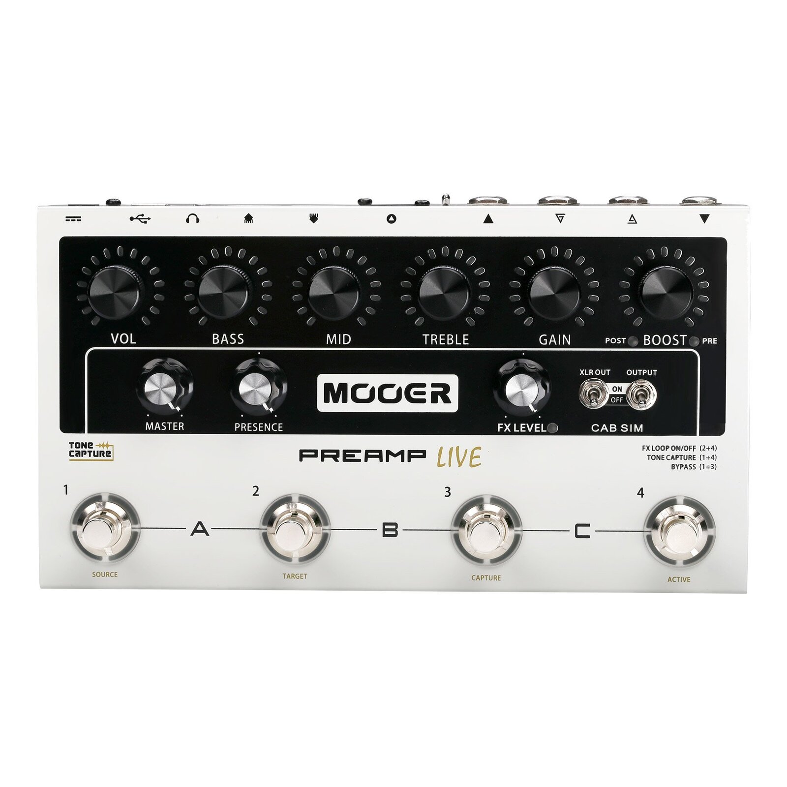 The Mooer MEP-PALIVE Preamp Live is a compact four channel preamp with cabinet simulation. Preamp Live has been designed from the ground up to be the ultimate digital preamp modeller for use in a live situation. Every control feature has been carefully thought out to be intuitive and provide the best experience for live performance. Preamp Live provides a wide array of different amp tones right at your feet. It lets you select and carry 12 independent preamp channels of your choice, from a selection of 50 models available within the supporting software and mobile apps. Added to each of the 12 preamp channels is a dual position booster, adjustable pre and post noise gates, a fully programmable effects loop with different modes, full channel switching control, MIDI IN and OUT, dedicated headphone connection, multiple outputs with optional cab simulation and IR loading capabilities. Ever wanted to get UK overdrive from your F style amp? Or sparkling, spanky cleans from your M style amp? The effects loop in Preamp Live has a unique A/B mode which lets you use your amplifiers analogue preamp along with the digital models. This effectively expands the tonal palette of your amplifier without the need for an expensive, complicated switching device. Features: Contains 12 independent preamp channels with intuitive, familiar switching controls Pre/Post BOOSTER and adjustable Pre/Post noise gates for each channel Easily accessible global controls for fast setup in different live situations Optional independent speaker cab sim for each output IR loading via the supporting software and mobile apps Fully programmable effects loop with serial and A/B modes. For use with external effects or combining with your head or combo's own preamp using the 4-cable method TONE CAPTURE for sampling your real amplifiers tonal characteristics and creating new digital preamp models Dedicated headphone output for use as a stand-alone practice unit Fully mappable MIDI IN and MIDI OUT for integration with other equipment USB and Bluetooth for connecting to PC, MAC and MOBILE APP for deep editing and amp selection Specs: Preamp Channels : 12 Input: 1/4'' mono audio jack (impedance 500k) Outputs: 1 x 1/4'' mono audio jack (impedance100Ω) Effects Send: 1/4'' mono audio jack (impedance100Ω) Effects Return: 1/4'' mono audio jack (impedance 500k) USB: Type-B Female Connector Sampling accuracy: 24bit Signal to noise ratio: 103dB Effects Loop: Mode 1 Serial ~ Mode 2 A/B MIDI IN & OUT: 5 pin DIN connector Sampling rate: 88.2KHz Power requirements: 9V-12V DC 1A Dimensions: 230mm x 130mm x 54mm Weight: 1.18Kg Accessories: 1 x USB Cable