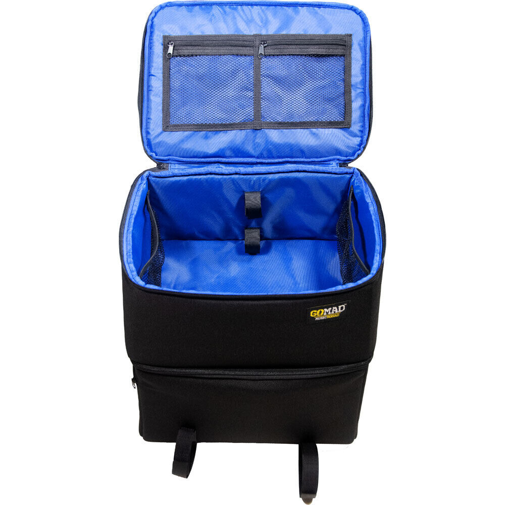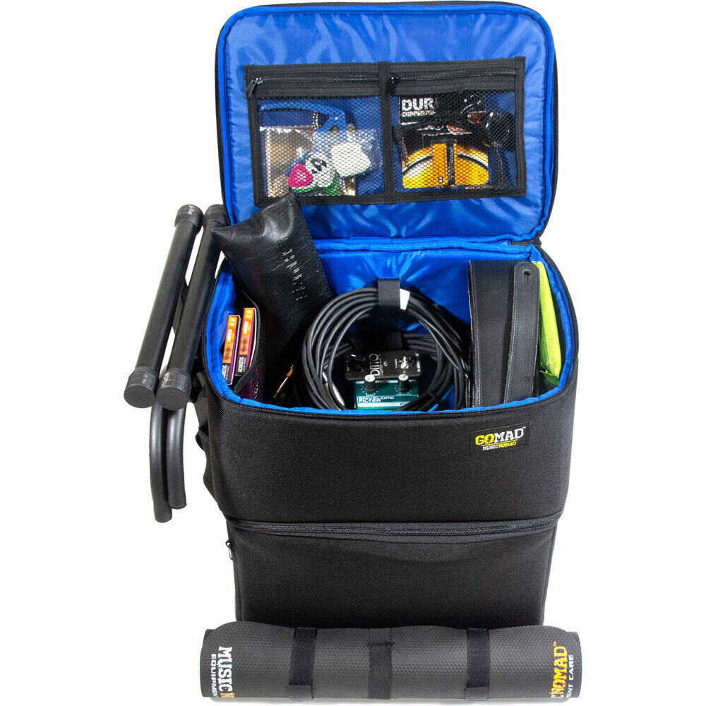 Finally, a gear bag with backpack straps designed and built with the guitar player in mind! Music Nomad's GOMAD Guitarist Gear Bag has all the backstage and onstage organization needed to play and maintain your equipment. The two large and sturdy stacked compartments not only store a ton, but it's easy to find what you need quickly. The rugged, weather-resistant exterior features 1200D recycled polyester (rPET) made from recycled water bottles. No detail is overlooked, including 15 sidewall storage compartments all easy to see and access, plus straps to store your work mat, guitar stand and cables. Additional features include an impressive 36 liters of total storage, high quality external zippers, 1/2" padded construction on all sides to protect your gear, thick air mesh comfort shoulder and hand straps, and a moveable padded divider partition. Load it up and take it wherever you go, the studio, home, shop, gig and rehearsal. That's Music Nomad quality, raising the bar in equipment care. FEATURES: Rugged, weather-resistant exterior 1200D recycled polyester (rPET) from recycled water bottles. Includes 15 sidewall storage compartments all easy to see, plus straps to store your work mat, guitar stand and cables, high quality external zippers, 1/2" padded construction to protect your gear, thick air mesh comfort shoulder and hand straps, and a moveable padded divider partition. Overall Dimensions (D x W x H): 11" (27.9 cm) x 15" (38.1 cm) x 16.50" (41.9cm) Inside Compartment Sizes: Top (D x W x H): 10" (25.4cm) x 14" (35.6cm) x 6.5" (16.5cm) / Stores 910 cubic inches = 15 liters. Bottom (D x W x H): 10" (25.4cm) x 14" (35.6cm) x 9" (23.1cm) / Stores 1260 cubic inches = 20.7 liters