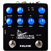 Designed by a Bassist for Bass Lovers. We collaborated with American bass player Melvin Lee Davis to create the NU-X MLD Bass Preamp & DI. Melvin Lee Davis is an American bass player, vocalist, keyboard player, producer, TV composer and engineer based in Orange County, California. He is the music director for Grammy-award winning artist Chaka Khan and has recorded with The Pointer Sisters, Lee Ritenour, Bryan Ferry, Patti Austin and Gladys Knight & the Pips. MLD Bass Preamp + DI has tons of functions based on Melvin Lee Davis' musical experience. And offers the best sound-shaping controls such as: 3-band EQ with middle-frequency selection, drive with blend control, speaker cabinet simulation (Impulse Response loader) and built-in noise reduction with Decay and Threshold controls. Specifications: 24-bit, 48KHz Impulse Response: 1024 length (20.33ms) Latency: 1ms 3-band EQ with Middle-frequency selector Drive with blend control Built-in noise reduction Impulse Response loader, speaker cabinet simulation 1/4" instrument input 1/4" through output and main output XLR DI output 1/8" headphone output 1/8" Auxillary in for music player connection Micro B USB input for firmware update, software control, IR loading, and audio stream Features: MLD signature Bass Preamp + DI features fully sweepable mid-range frequencies in addition to Bass and Treble controls. Melvin L. Davis is proficient at 4, 5, 6 and 7 string basses, so MLD Bass Preamp has a wide range of frequency control. Volume Knob Adjusts the overall output volume of the pedal. Ideal for fine-tuning the output on clean tone, it also controls the DI output volume. Blend Knob Adjusts to blend between the clean signal and overdrive signal. The clean signal remains as unity gain, allowing for fine control of the blend ration. Drive Knob Adjusts the Gain level and sets the saturation level in the overdriven signal. 3-Band Equalizer with Middle Frequency Selector Bass: +/- 12dB @40Hz Middle: +/- 17dB @160Hz to 1000Hz Freq.: 160Hz ~ 1000Hz Treble: +/- 12dB @8000Hz DI Output Balanced XLR Output carrying the mic-level output signal, either affected or unaffected depending on the Pre-Post switch. GND LFT (Ground / Lift) Toggle Switch Disconnects the signal ground on the DI out to break any ground loops. Toggle the switch to the LESS noisy position; it can be either GND or LFT depending on the room, stage or studio condition. Switch does not effect the 1/4-inch (6.5mm) output. Impulse Response (IR) Toggle Switches You can activate/deactivate the IR cabinet simulation for both DI out and 1/4-inch (6.5mm) out separately. Use the appropriate IR toggle switch to turn ON/OFF the emulation for the output you choose. Input/Output and USB Connections Main OUT and Through You can use the main "OUT" and "THROUGH" output to get the dry signal for bass amplifier connection. When you activate the "OUT IR" cabinet simulation, you can connect the pedal to any FRFR speaker, directly to a mixer or audio interface. "THROUGH" output will remain bypassed either the "OUT IR" is activated or deactivated. DI Out, Auxiliary Input and Headphone Output On the LEFT SIDE of the PEDAL, you can access the XLR output for a mixer and/or audio interface connection, and you have the option of activating the IR cabinet simulation. There is a 1/8-inch (3.5mm) auxiliary input to connect a music player, and headphones output for silent practicing or monitoring (please check the USB connection). Headphone output is related to DI out, when you activate the DI IR simulation, headphones output will be simulated. NUX Bass Preamp + DI Software You can connect the pedal to your Windows / MAC computer to use the editor software. You can load your own IR files and control various other settings. Supported IR file: 48 kHz / 24-bit, 1024 Samples Bass Amplifier Models MLD Bass Preamp + DI pedal comes with 2 amplifier models, you can select and control the amps and the Noise Reduction on the software easily. There will be more amp models released . . . stay tuned ! Speaker Cabinet Models (IR) There are 8 IR presets (4 factory / 4 user) in the Melvin Lee Davis Bass Preamp + DI, and the pedal comes with the selection of speaker cabinet IR files created by NUX. Also there is an independent volume control for the cabinet simulation to adjust the IR level. Signal Routing There are 3 ROUTING OPTIONS for the USB audio streaming: NORMAL: You can create your tone by using the pedal, and it will send the processed signal to the recording software. DRY OUT: You can record your bass guitar without any preamp effect and IR simulation. This option is useful for re-amping. REAMP: You can playback a recorded track on the recording software, and send it to another track. MLD Preamp will process the signal while recording to a new track. (see: Re-amp Routing) Recording With Melvin Lee Davis Bass Preamp You can record your bass guitar without using any audio interface. MLD Bass Preamp + DI has a built-in audio streaming function, so you can connect the pedal directly to your computer with a Micro B USB cable, and it is ready to play and record. A driver-free* solution helps you produce music with direct connection. You can use the headphones output for monitoring, you will hear both your guitar and the audio from your computer. PLEASE NOTE: Run the audio recording software first, then run the MLD Bass Preamp Editor Software to use it properly. *Driver-free: macOS only. It's suggested that all Windows users install the NUX Audio Driver to ensure better performance. Please download on the Support page. ** Free Firmware Updates and Manuals are available by clicking here then selecting "Support"