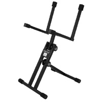 The strength and versatility of this stand comes from the double clutch disk that allows you to remove and rotate the support arm assembly. The solid steel double stamped 3" disk allows for a secure locking position every time! The A-Frame base with 1" square tubing construction will adjust its floor spread in order for you to get the most support under your amp. Ridged end caps keep all metal surfaces off the ground and act as a shock absorber. Applications: Stage/studio amplifiers and monitors Weight Capacity: 90 lbs. Arm Width: 12" Arm Depth: 11" Base Spread: 17" Construction: All-Steel Colour: Black Powder Coat Finish
