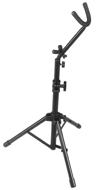 Designed for use when standing, this extra tall stand holds an alto or tenor saxophone at a height that can be easily reached without having to bend over. The adjustable upper and lower yoke support securely hold the saxophone in place. The lower cross yo