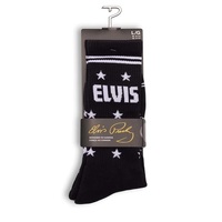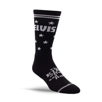 Feel like a star in these Elvis "King Of Rock And Roll" socks. Dubbed the "King of Rock and Roll" Elvis Presley is regarded as one of the most significant cultural icons of the 20th century. His energized interpretations of songs and sexually provocative performance style, combined with a singularly potent mix of influences across color lines during a transformative era in race relations, led him to both great success and initial controversy. FEATURES: 1 pair soft premium combed cotton Spandex added for stretch and comfort Terry cushion sole extends above heel with toe seam buried in cushion for padded comfort 2 x 1 rib leg with knit in Elvis logo/stripes and stars on leg. Knit in 'the King of Rock and Roll' on top of foot Elasticized arch compression to keep sock in place SPECIFICATIONS: Pattern: ELVIS "The King" Colour: Black Type: Crew Size: Large (Men 9-12, Women 11-14) Made From: 71% Cotton, 26% Nylon, 2% Spandex, 1% Other fiber exclusive of elastic Care Instructions: Machine wash and tumble dry. Package: 1-Pair