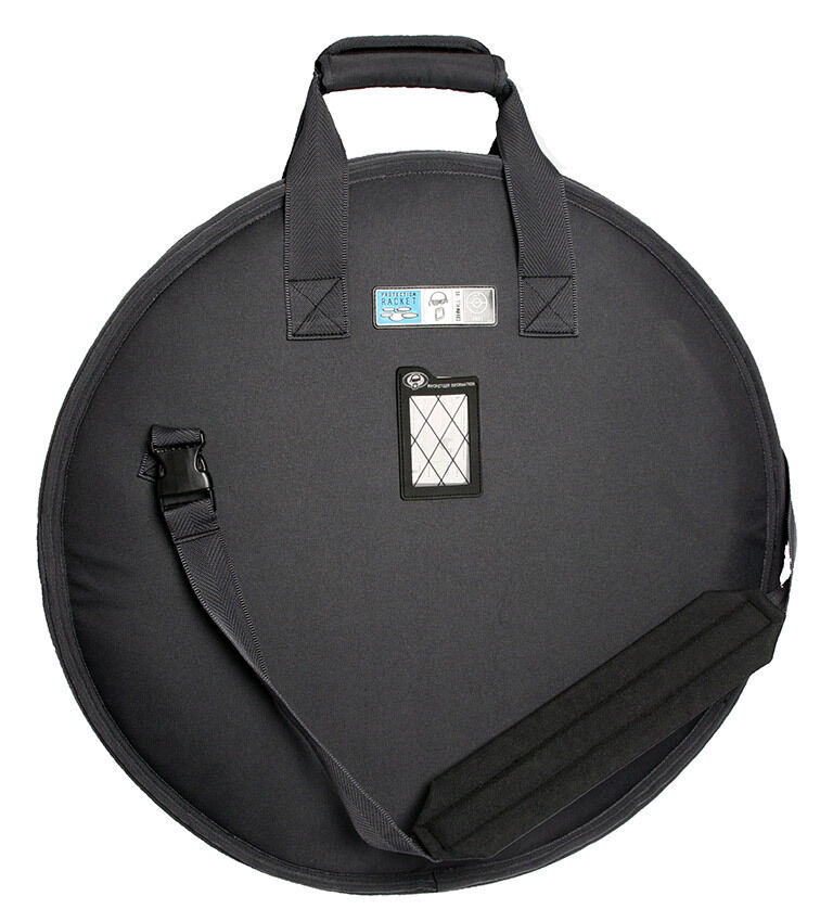 The Protection Racket 22" Deluxe Cymbal case has internal diameter of 22.5" for easy entry and exit of largest 22 cymbal. Outer hi-hat pocket is 15.5" and will accept hi-hats up to 15". Both the inner & outer compartments have removable Propile synthetic fleece dividers to separate your cymbals. Both compartments will hold and divide 4 cymbals. So 4 cymbals in each compartment & 2 either side = total of 6 cymbals in each compartment. When it comes to construction of our cases, there is no compromise in material quality. A lot of thought, experience and rigorous testing go into every case. From concept to design to production can take up to 18 months and every case is put through its paces by Team Protection Racket. By the time it's reached the store, we have 100% confidence in its performance.  For design, quality, reliability, choice and confidence, nothing comes close. Features: 600 Denier polyester outer.  Hardwearing and waterproof 8mm Bini combination foam core. 3mm hard on the outside for extra protection, 5mm softer inner for shock absorbency Non abrasive synthetic fleece interior for smooth protection and cleaning  of cymbals in transit 4" poly-prop plastic strengthener sewn into base of case to prevent cymbals wearing through Both compartments have removable fleece dividers for separating cymbals Highest quality YKK zip and nickel plated stainless steel zip pulls Comfortable foam/neoprene carry handle Fully padded and adjustable shoulder strap 2 x AAA side grab handles on both ends of case for alternative lifting Silicone luggage tag with identity card Silicone size label showing case drum size Specifications: Main Compartment Depth: 22.5" x 3.5" Internal dividers in both compartments have 4 compartments & 2 x cymbals fit either side. Main compartment can take 6 cymbals, smaller front pocket can take 1 x set hi-hats and 2 x splashes. Weight: 3.0kg