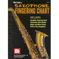 A graphic, easy-to-understand fingering chart for any saxophone which features chromatic, major and minor scale studies. Contains staff notation and fingering diagrams for the entire range of the saxophone, plus a diagram of parts of the sax. Printed on s