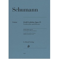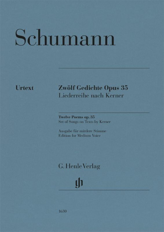 As with the Dichterliebe (HN 549), Frauenliebe und Leben (HN 547) or the song cycles with texts by Heine and Eichendorff (HN 548 and 550), the Kerner Cycle op. 35 was written in 1840, Schumann's "Liederjahr". Yet it has a special place: it was composed in the time immediately following Schumann's marriage to Clara Wieck. Schumann set a series of poems to music in November, during a "quiet week, which went by with composing and much loving and kissing", and the cycle was complete by the turn of the year. It contains a great deal of intimate musical innuendos. The first edition of 1841 was soon followed by a second issue, many of the songs were published individually and the "Wanderlied" soon became a core piece in the repertoire. With Henle's edition the songs in Schumann's cycle are once again being published together in a single volume. Twelve Poems Op. 35 Composer: Robert Schumann Publisher: G. Henle Verlag Instrument: Voice Pages: 58