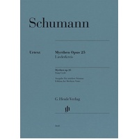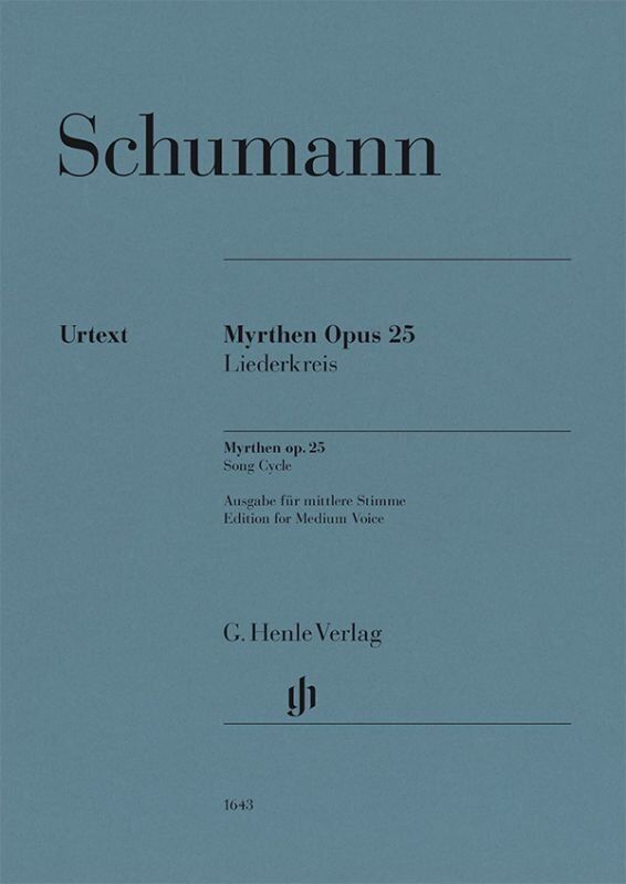 1840 was Schumann's famous "year of song" that brought forth over 100 lieder. They included Myrthen op. 25, which he dedicated "to his dear bride", Clara Wieck-Schumann. Besides famous songs such as "Widmung", "Lotosblume" and "Nussbaum" to texts by German poets, the collection also saw Schumann venture further afield, whether to the Scottish Highlands with settings of Robert Burns or to Italy for the "Venetian Songs" of Thomas Moore. Schumann specialist Kazuko Ozawa has examined the first edition of 1840 and all the manuscript sources. Among the dedicatory autograph copies she has also discovered interesting early versions of individual songs that are here published in an appendix. The edition medium voice presented here was created in collaboration with the experienced pianist and Lied accompanist Jan Philip Schulze – to make the famous cycle accessible to a wider circle of singers. Myrthen Op. 25, Song Cycle Composer: Robert Schumann Publisher: G. Henle Verlag Instrument: Voice Pages: 92