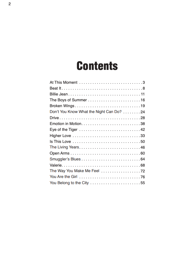 Simply Rock 80s Simply Rock 80s is a collection of some of the greatest songs from one of the most defining decades in pop music history. Phrase markings, articulations, fingering, and dynamics have been included to aid with interpretation, and a large print size makes the notation easy to read. Titles: At This Moment • Beat It • Billie Jean • The Boys of Summer • Broken Wings • Don't You Know What the Night Can Do? • Drive • Emotion in Motion • Eye of the Tiger • Higher Love • Is This Love • The Living Years • Open Arms • Smuggler's Blues • Valerie • The Way You Make Me Feel • You Are the Girl • You Belong to the City.