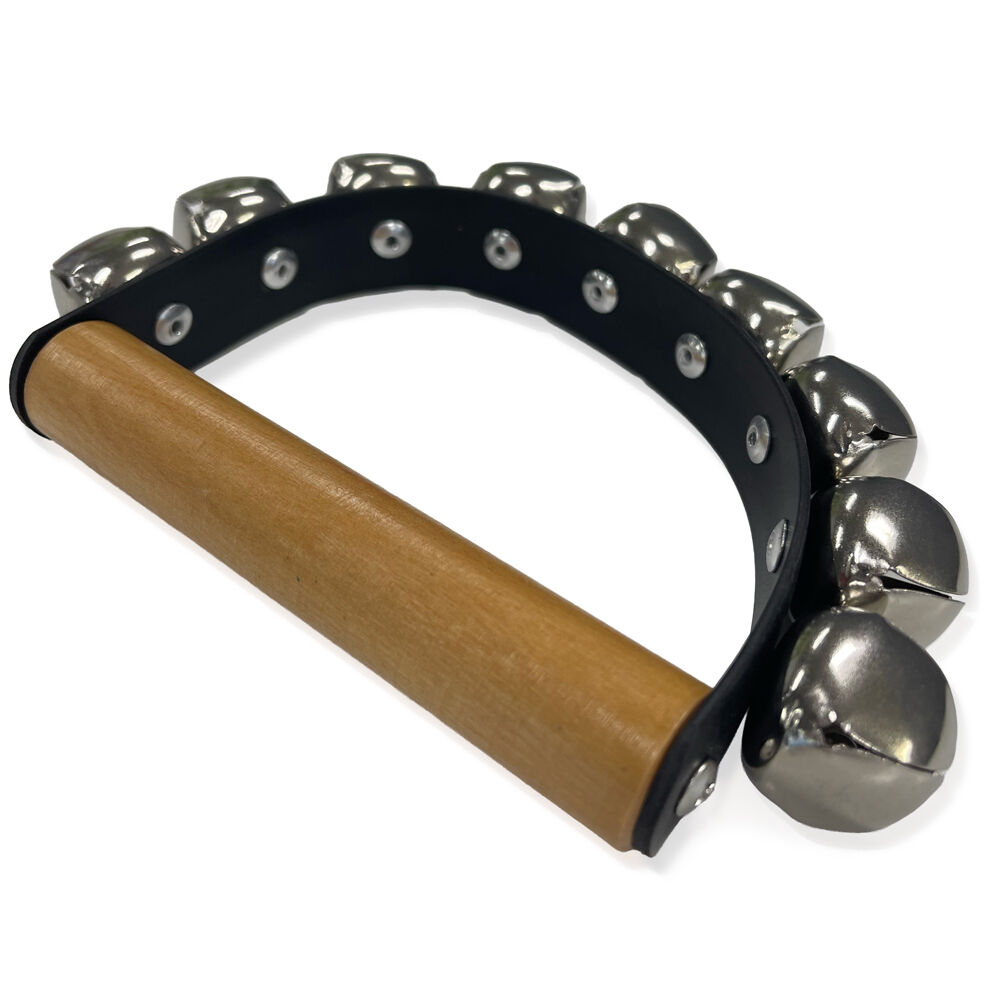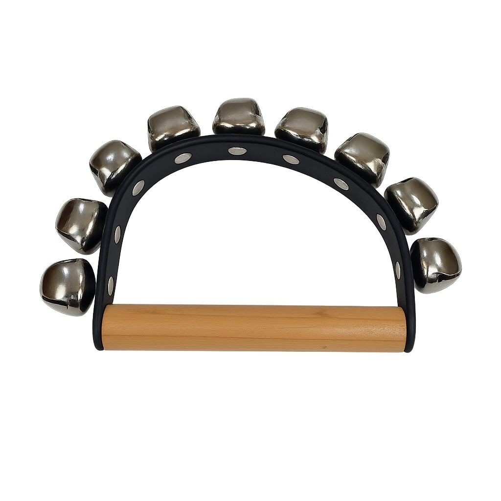 9 Bells – Standard Sleigh Bells. Horseshoe shape with large nickel-plated bells. These bells ring with the image of a team of horses prancing through fresh snow.