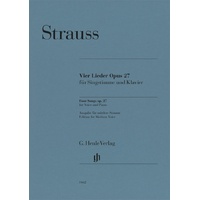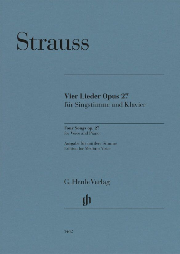 The first edition of op. 27, published in 1894 for high voice, was followed during the composer's lifetime by transposed versions for middle and low registers, something that was then to become the rule for all of Strauss's songs. These transpositions have proven themselves to this day, and this Henle Urtext edition for medium voice also uses them in order to offer this wonderful song cycle to every voice type. Four Songs Op. 27 Composer: Richard Strauss Publisher: G. Henle Verlag Instrument: Voice Pages: 27