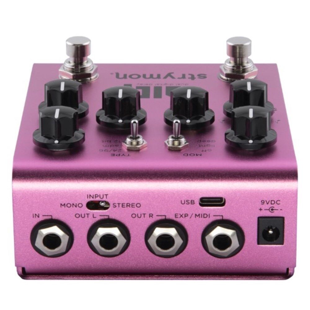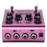 Specs Ins, Outs, and Switches High impedance ultra low-noise discrete Class A JFET TRS stereo input. Low impedance independent TS stereo outputs. Expression pedal input allows the connection of a TRS expression pedal, MiniSwitch, MultiSwitch Plus, or TRS MIDI connection. USB jack for controlling via MIDI from a computer or for performing firmware updates. Dedicated Tap Tempo & On/Off footswitches Audio Quality Premium JFET analog front end Ultra low noise, high performance 24-bit 96kHz A/D and D/A converters provide uncompromising audio quality 520MHz ARM Superscalar processor 32-bit floating point processing 20Hz to 20kHz frequency response Audio Input Impedance: 1M Ohm Audio Output Impedance: 100 Ohm More Strong and lightweight pink aluminum chassis 9V DC power supply included Power requirements: maximum 9 volts DC center-negative, with a minimum of 300mA of current Dimensions: 4.5” deep x 4” wide x 1.75” tall 11.4 cm deep x 10.2 cm wide x 4.4 cm tall Designed and built in the USA