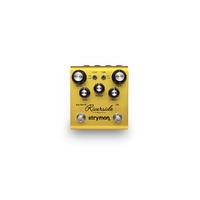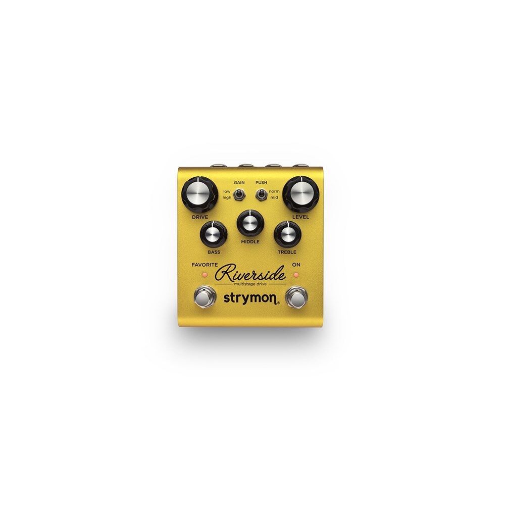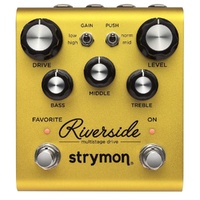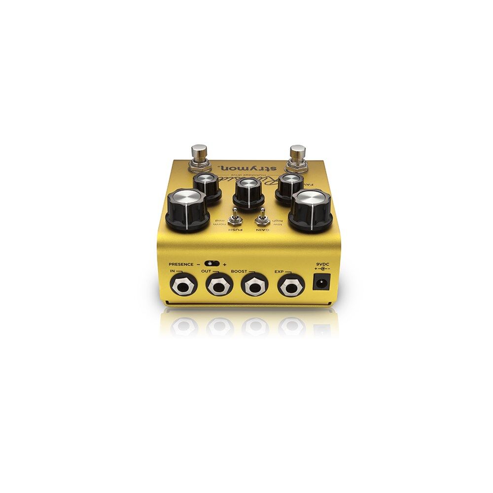 Specs Sound Design Custom cascading multistage distortion topology provides a wide range of tube-inspired drive tones Digitally controlled analog class A JFET input gain stage maximizes headroom while adding up to 20dB of pure analog gain Precision crafted DSP gain stages provide detailed complexity and responsiveness Low gain channel for smooth classic overdrive High gain channel for modern saturated distortion 3-band EQ with independent Bass, Middle and Treble controls Selectable post-analog gain mid-band EQ push Presence switch to tailor the sound for use with all amplifiers from dark to bright Optional variable-threshold noise reduction helps tame noisy guitar pickups Ins, Outs, Switches High impedance mono input Mono output Favorite footswitch to save a favorite setting Favorite Input to connect an external MiniSwitch to recall a Favorite preset Expression pedal input allows the connection an expression pedal for simultaneous morphing control over multiple parameters (Expression mode), or logarithmic taper for smooth volume control (Volume mode) MIDI accessible via Expression jack for remote parameter control and access to 300 preset locations Boost pedal input allows connection of an external footswitch for up to +6dB of analog boost, or to toggle the Favorite preset on other Strymon pedals (Favorite Out model) Audio Quality Ultra low noise, high performance 24-bit 96kHz A/D and D/A converters provide uncompromising audio quality Premium analog front end and output section Super high performance SHARC DSP in a compact form factor 32-bit floating point processing More True Bypass (electromechanical relay switching) or selectable transparent Analog Buffered Bypass Strong and lightweight anodized gold aluminum chassis 9V DC power supply included Power requirements: maximum 9 volts DC center-negative, with a minimum of 250mA of current Dimensions: 4.5″ deep x 4″ wide x 1.75″ tall 11.4 cm deep x 10.2 cm wide x 4.4 cm tall Designed and built in the USA