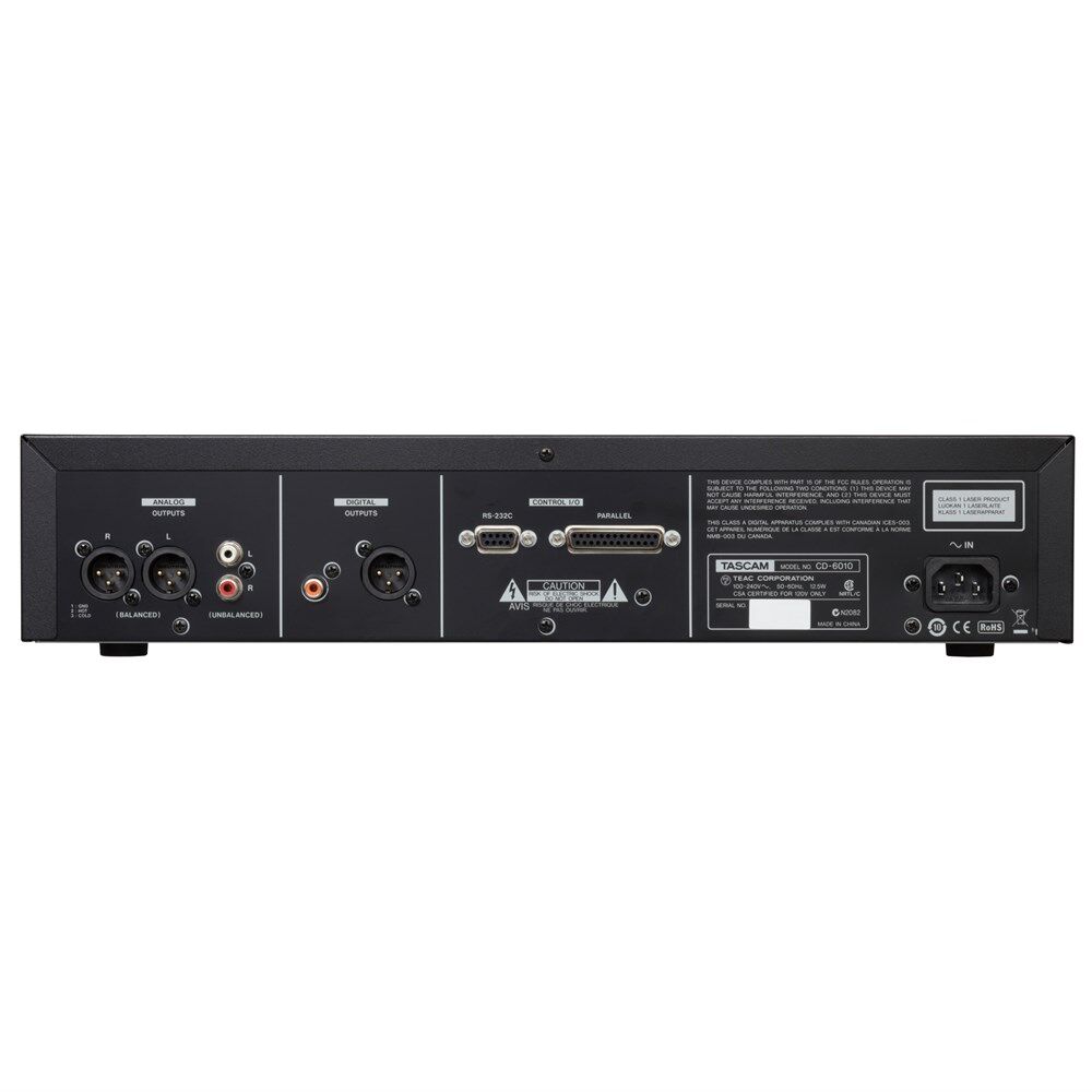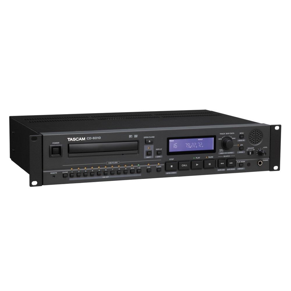 The CD-6010 is a 2U rack-mountable CD player that meets the demands of broadcasting operations, equipped with the same highly-durable CD drive as the high-end CD-player for broadcasting operations applications, the CD-9010CF/CD-9010. While addressing the durability and sound quality required in broadcasting operations, the minimum specs that are required for broadcasting operations were installed in the 2U rackmount size to enable such application in various environments. CD-5010B Drive Mechanism The CD-6010 employs the CD-5010B drive - also used in the state-of-the-art TASCAM CD-9010 & CD-9010CF. The industry-standard drive has been improved with a faster open/close time, and has a manual eject hole in case of power failure. Gold-plated NEUTRIK Connectors Neutrik connectors resist oxidation in long-term use and provide solid connectivity. 10 Keys Provide 20 Points of Flash Start The flash-start function plays back from internal memory with no lag time. The CD-6010 also has a cue point flash-start function - also with eliminated lag. Built-in Monitor Speaker The monitor speaker increases efficiency by offering a way to reference tracks directly from the unit. The speaker has an on/off switch and volume control. Additional Features Features at a Glance CD-DA, MP3 and WAV file playback Supports various remote control units XLR balanced outputs RCA unbalanced outputs XLR digital output (AES/EBU) Coaxial digital output (S/PDIF) Built-in monitor speaker with on/off switch Headphone output Parallel control (D-sub 25-pin) RS-232C serial control (D-sub 9-pin) Relay play with multiple units Auto Cue, Auto Ready, Incremental Play All, single, random and A-B repeat play modes Frame accuracy search Skip-back play +/- 16% pitch control Up to 100 discs of program memory Interval time setting between tracks Fader start / event start Track elapsed, track remain, and disc remain time display Intro check Power-on play Index search (CD-DA discs) and directory search (MP3 discs) Fade in/out (0 to 10 sec., in 0.5 sec. steps) Mono output Resume EOM (End of music time) Panel key lock function for avoiding accidental error operation Shock-proof memory Wireless remote controller included 2U rack-mountable