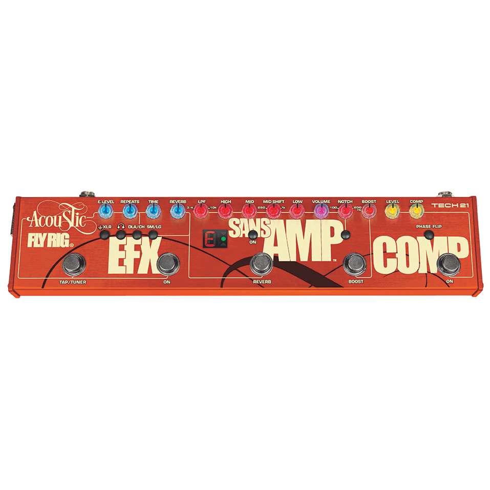 The Tech 21 Fly Rig Series is known for travel-friendly, grab-and-go pro tones for live and studio dates. The latest addition to the series is the Acoustic Fly Rig. Specifically tailored to complement the particular nuances and traits of acoustic instruments, the Acoustic Fly Rig provides round-the-clock ease and confidence for any gig, anywhere and everywhere you perform. COMP COMP, for compression, utilizes old school, all-analog, FET-based technology, which is inherently warmer, more transparent and musical. REVERB Dedicated Reverb function emulates the rich ambiance of open spaces, ranging from room to hall. DLA/CHR DLA emulates a warm sounding analog delay. It features Time and Repeats controls and dedicated Tap Tempo footswitch. CHR is a preset chorus based on pitch-shifting technology for a more natural, 12-string-style sound. TUNER Chromatic Tuner is within the EFX section. You simply hold down the TAP/TUNER footswitch to engage the Tuner, which simultaneously mutes the signal path. SANSAMP The all-analog SansAmp is, of course, its center point. Sweepable, semi-parametric, active EQ controls provide professional grade tweakability for any situation. There’s a Notch Filter, sweepable from 70Hz to 350Hz, designed to diminish the sensitivity for feedback caused by the resonating, low frequencies of acoustic guitars. A Low Pass Filter, sweepable from 16kHz to 1.5kHz, rolls off undesirable frequencies and artifacts. BOOST Independent Boost function, up to approx 12dB, for solos. Includes a wide mid-range boost for improved clarity. OTHER FEATURES: •  Phase Flip switch flips the signal 180 degrees in phase to help combat feedback •  1/4-inch 1megOhm input •  XLR‰Ûöoutput with ground lift •  1/4-inch low impedance output •  Headphone button switches the 1/4” output into headphone mode •  Rugged, all-metal housing •  Metal footswitches and jacks •  Silent-switching, custom footswitch actuators •  Utilizes included 9V DC power supply, 200mA. North America: Model #DC4-A / International: Model #DC4-D Note: International power supplies are “auto-switching,” self-adjusting 100V-240V. Can be used anywhere in the world with the proper plug/travel adapter for the host country.