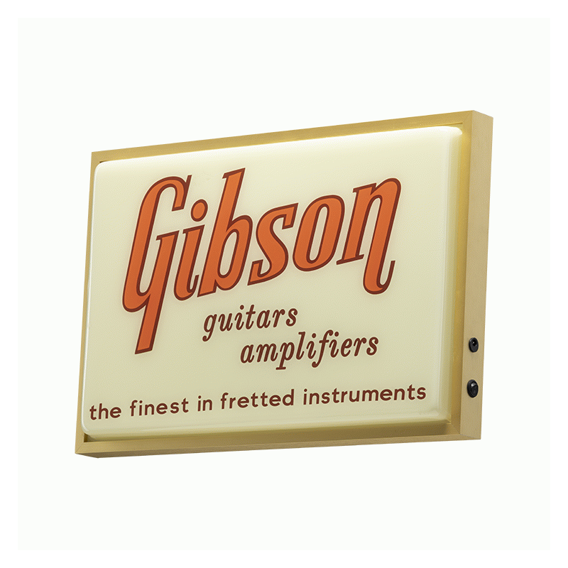 This sign was inspired by the design of a rare vintage Gibson Guitars & Amplifiers dealer sign from days gone by. Combining retro style with modern features like LED backlighting, this Gibson Vintage Lighted Sign will be a stylish addition to your music room, office, or home.