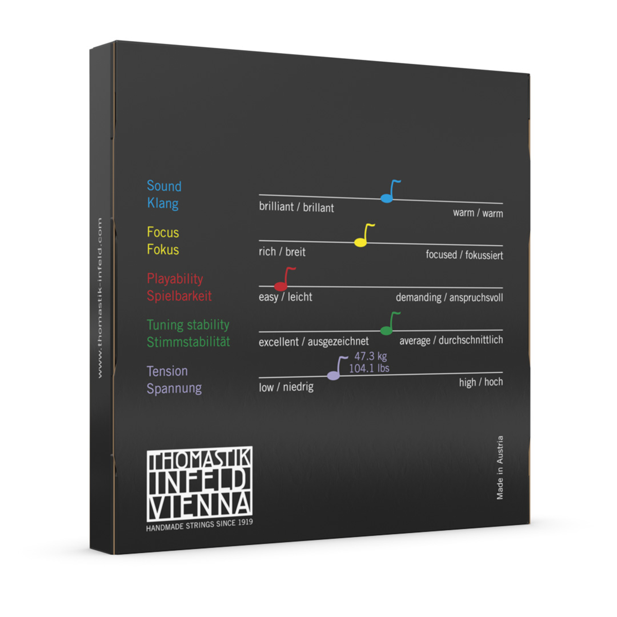 Thomastik Dominant for Cello The Dominant string is a highly flexible, multistrand synthetic core string for tonal warmth and feel of gut and is impervious to changes in humidity, allowing for stable intonation and long life. The sound is soft, clear and rich in overtones. Available Sizes | Gauges 4/4 | medium, heavy 3/4 | medium 1/2 | medium 1/4 | medium 1/8 | medium Click here to download the Thomastik guide / glossary of terms Cello 4/4 vibrating string length 70cm | 27.6" MEDIUM HEAVY NR. Core Material Outer Material Tailpiece End kg lb Peg End kg lb Peg End DT142 a la I Synthetic Core Chrome Wound 14.0 30.9 14.8 32.6 DT143 d re II Synthetic Core Chrome Wound 11.3 24.9 12.6 27.8 DT144 G Sol III Synthetic Core Chrome Wound 10.4 22.9 11.5 25.4 DT144A G Sol III Synthetic Core Silver Wound 11.6 25.6 DT145 C Do IV Synthetic Core Chrome Wound 10.2 22.5 11.2 24.7 DT145A C Do IV Synthetic Core Silver Wound 12.1 26.7 SET NR. DT147 DT142; DT143; DT144; DT145 MEDIUM 45.9 kg | 101.2 lb HEAVY 50.1 kg | 110.5 lb Click here to download the Thomastik guide / glossary of terms Download the full comprehensive Thomastik catalogue