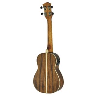 The Tiki range of ukuleles by Timberidge are fast becoming one of the chosen brands by professional uke players throughout Australia and the rest of the world. Tikis are known for outstanding craftsmanship and superior wood selection which contribute to exceptional playability and brilliant tone. The Tiki TKC-9P-NST Concert Ukulele features a solid Koa top, Koa back and sides, Rosewood fingerboard and chrome open back tuners with black buttons, superbly finished with deluxe timber binding, rosette, heel plate and back strip. The built-in Tiki UK-500T pickup provides 3-Band EQ, volume control and a chromatic LED tuner, giving you the option of plugging into an amplifier, PA system and a wide range of recording devices. The '9 Series' range of ukuleles come complete with a Deluxe Tiki Paisley hard case. BRAND: TIMBERIDGE TIKI MODEL: TKC-9P-NST INSTRUMENT: ELECTRIC UKULELE SIZE: CONCERT COLOUR: NATURAL SATIN DEXTERITY: RIGHT STRINGS: 4 STRING TOP: SOLID KOA BACK / SIDES: KOA NECK: MAHOGANY FINGERBOARD: ROSEWOOD BRIDGE: ROSEWOOD BRIDGE SADDLE: 52 mm SCALE LENGTH: 15 INCHES NUT WIDTH: 35 mm MACHINE HEADS: TIKI PICKUP SYSTEM: TIKI UKT-500T BUILT IN TUNER: Y FRETS: 16 WARRANTY: 2 YEARS INCLUDES CASE: TIKI PAISLEY BROWN CASE LENGTH: 620 mm DEPTH: 75 mm UPPER BOUT: 155 mm LOWER BOUT: 20 5 mm WEIGHT: 0.5 kg