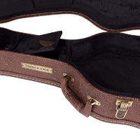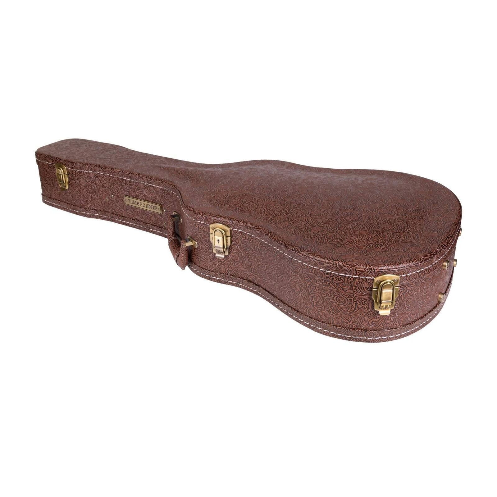 The Timberidge deluxe dreadnought acoustic guitar case keeps your precious musical investment secure while standing out from the competition with its head turning good looks. Features heavy duty plywood construction with impact resistant reinforced arched top, paisley patterned brown vinyl exterior covering, black plush padded interior, deluxe padded carry handle, accessories compartment, metal feet on base and back, as well as antique finish latches (central latch is lockable). Please check the case dimensions provided to ensure your instruments correct fit. *Guitar not included.