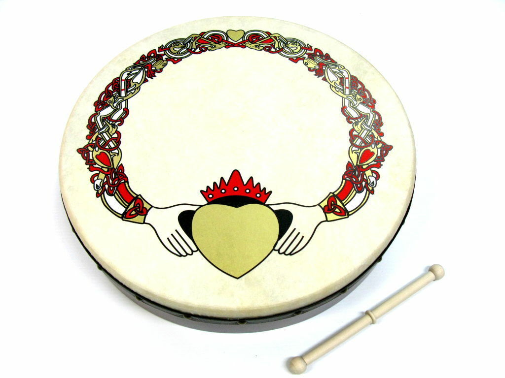 WALTONS 18" CLADDAGH BODHRAN. 18" Bodhran with "Claddagh" Print on head. Each Bodhran features a wooden ply shell and traditional beater.