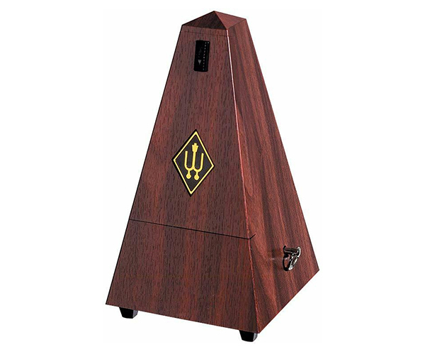 Mahogany Wittner "Pyramid" Plastic Metronome. Maelzel series with bell. Wood-grain plastic with matching wood-grain front cover. (855111)