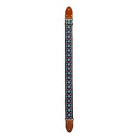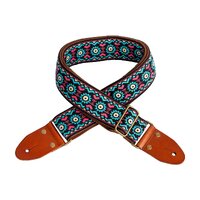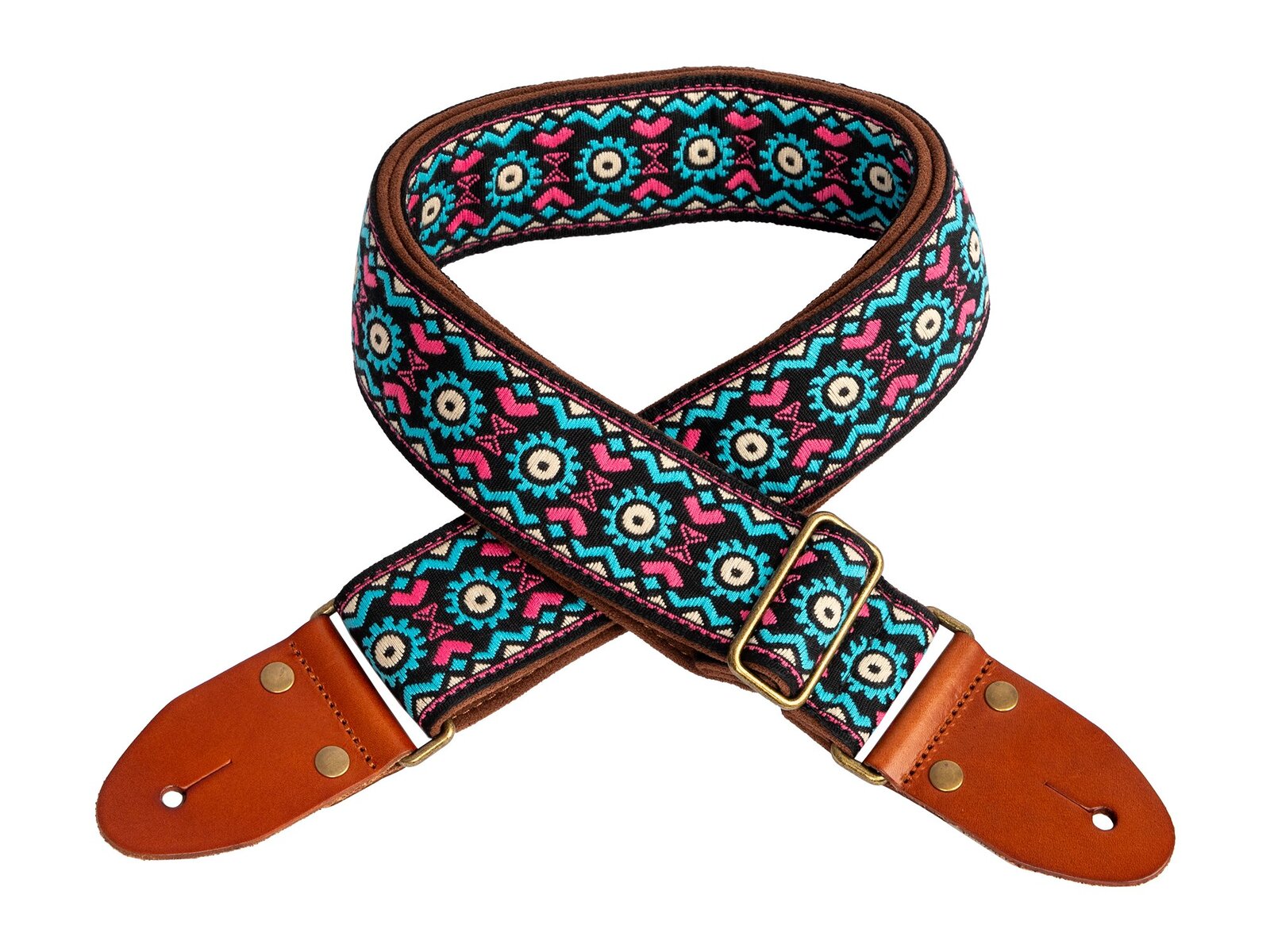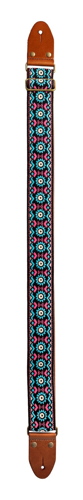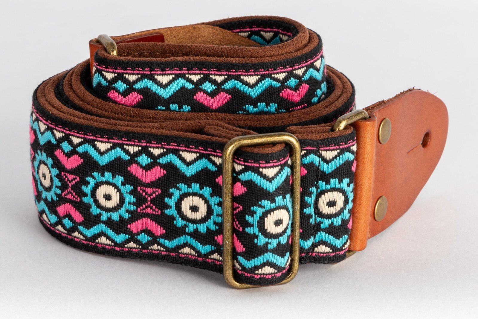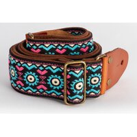 Woven jacquard poly cotton strap with soft two layer tan leather backing. Premium tan leather ends with antique brass rivets and smooth brass slider adjustment.
