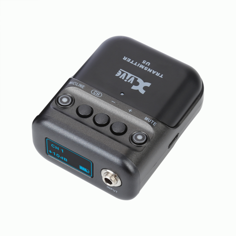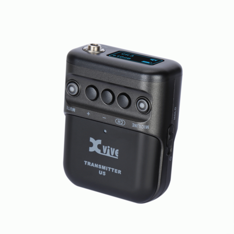 XVIVE U5T transmitter for the Xvive U5 wireless system. The U5 Wireless Audio for Video System is a versatile audio solution for video production and other speech-recording applications. It can be used to send audio wirelessly from the included LV1 lavali