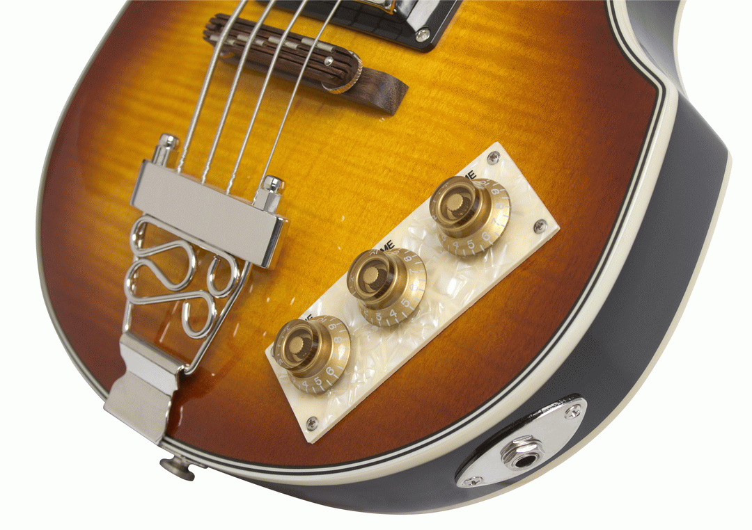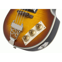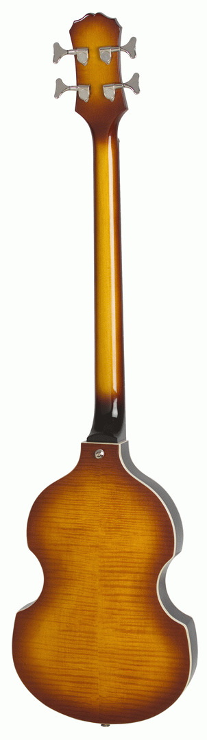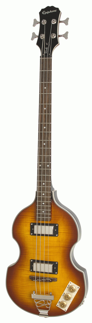 EPIPHONE VIOLA BASS VS Epiphone introduces the Viola, one of the most recognized basses in the world. A popular bass for British Invasion bands who couldnt afford finer Gibson and Epiphone instruments, the Violas unique construction and woody tone produce unique sound on stage and in the studio. Today, vintage models are difficult to find and are often plagued by vintage problems along with their vintage price tag. Epiphone engineers have solved those problems with our Viola, which has the same classic sound with improved pickups, hardware, and electronics. Body maple Neck maple Neck Joint set-glued Scale 30.5‚¬ï¿½ Fingerboard dot inlays Nut 1.65‚¬ï¿½ Neck Pickup NYR mini humbucker Bridge Pickup NYT mini humbucker Hardware Nickel Controls Neck volume, Bridge volume, Master Tone Bridge compensated saddle Color Vintage Sunburst (VS) Typical Weight (+/- 5%) 7.0 lbs