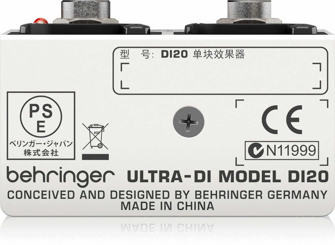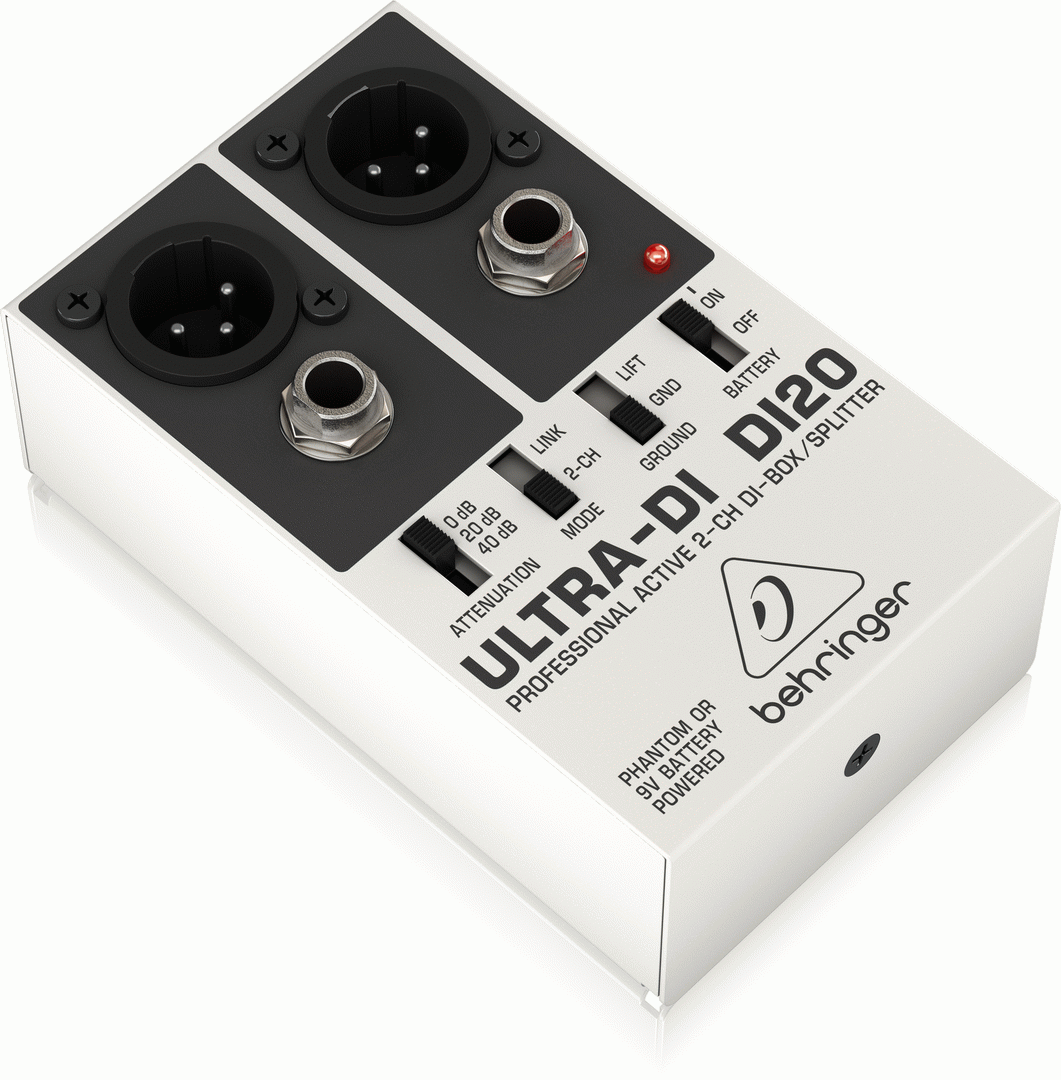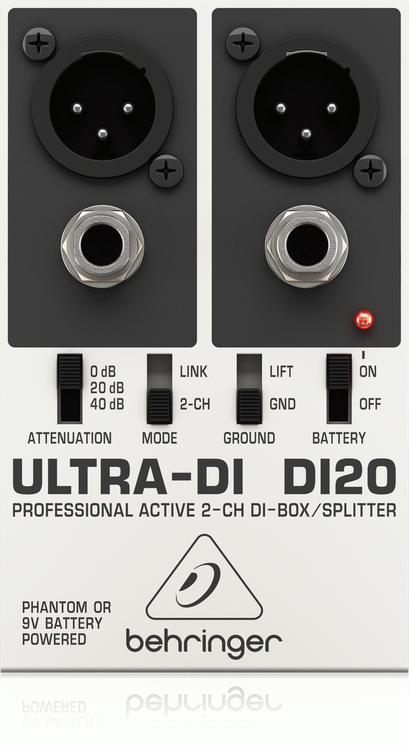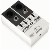 BEHRINGER ULTRA-DI DI20 DI BOX The ULTRA-DI DI20 is a one-of-a-kind DI (Direct Injection) box that can convert up to two separate, unbalanced ¼ " TRS lines into two balanced XLR outputs - or function as a signal splitter. Electric guitarists, keyboardists and bassists will love the flexibility the incredible DI20 provides both in the studio and on the stage. By flipping a switch, you can use the DI20 as a launching pad for two separate mono signals, a stereo signal - or a split-signal feeding two separate amps. The DI20 also features a superb ground-lift switch, and the 3-position input attenuator can accommodate input levels of up to +48 dBu. This handy built-in attenuator also allows you to connect directly to your amplifiers speaker outputs, even amps rated as high as 3,000 Watts. You can power the DI20 with either a 9 V battery or your mixers phantom power supply (+18 to +48 V DC). The whole package is wrapped in an ultra compact, road-suitable and rugged metal housing. Professional and multi-purpose direct injection box for stage and studio applications Provides impedance and signal matching for the direct connection of instruments to mixers and amplifiers Converts 2 independent unbalanced 1/4'' TRS line inputs into 2 balanced XLR outputs Additional Split mode (channel 1 assigns signal to both XLR outputs) Ultra-flat frequency response due to servo-balanced operation Internal battery automatically shuts off when phantom power is applied Allows direct connection to speaker outputs with up to 3,000 Watts Ground Lift switch eliminates typical ground loop problems Input 2 usable as channel 1 Link output (additional to XLR output) ¼ TRS and gold-plated XLR connectors Ultra-rugged, road-suitable metal case Designed and engineered in Germany