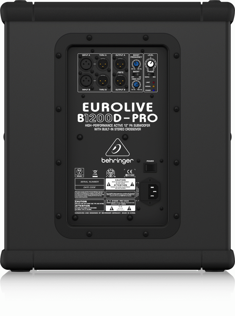 BEHRINGER EUROLIVE B1200D ACTIVE PRO SUBWOOFER Our EUROLIVE B1200D-PRO 500-Watt active subwoofer provides the ultimate in low-frequency reproduction, and the built-in stereo crossover makes it ideally suited for use with any of our active 2-way loudspeakers. Packed with a powerful 500-Watt Class-D amplifier, 15 long-excursion Low-Frequency (LF) transducer and an incredible array of professional features, the B1200DPRO produces extreme levels of low-end punch, with the definition and clarity typically reserved for much larger systems! Put simply, these cool-running systems are much lighter, making them ultra-easy to transport and set up - and our no-compromise design means you get amazingly-deep, chest-pounding bass that will keep the party going all night long. High-performance 500-Watt powered subwoofer for PA applications Powerful 12'' long-excursion transducer with high temperature voice coil provides incredibly accurate and pulse-pounding bass Precise reproduction of ultra-low frequencies for bulletproof punch and impact State-of-the-art 500-Watt Class-D amplifier with comprehensive over-excursion, thermal and clip limit protection Built-in active stereo crossover provides high-pass filtered outputs for full-range loudspeakers Tunable and switchable Bass Boost plus Phase switch for ultimate low-frequency performance Variable High Cut control for perfect sound alignment Subwoofer Level control to adjust the balance between subwoofer and the full-range speakers Power, Signal and Clip LEDs for perfect monitoring Intelligent limiter for maximum sound performance and woofer protection Internal switch-mode power supply for noise-free audio, superior transient response and very low power consumption Pole socket for mounting with commercial spacer poles Ergonomically shaped handles for easy transport Rugged steel grill for optimal speaker protection Designed and engineered in Germany