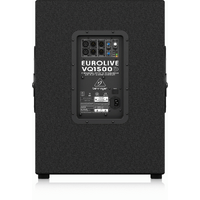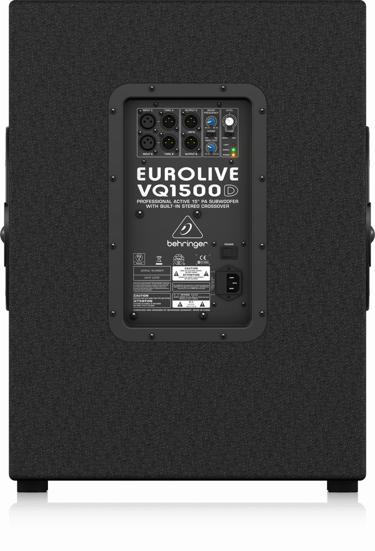 BEHRINGER EUROLIVE VQ1500D ACTIVE SUBWOOFER Our EUROLIVE VQ1500D 500-Watt active subwoofer provides the ultimate in low-frequency reproduction, and the built-in stereo crossover makes it ideally suited for use with any of our active 2-way loudspeakers. Packed with a powerful 500-Watt Class-D amplifier, 15 long-excursion Low-Frequency (LF) transducer and an incredible array of professional features, the VQ1500D produces extreme levels of low-end punch, with the definition and clarity typically reserved for much larger systems! Put simply, these cool-running systems are much lighter, making them ultra-easy to transport and set up - and our no-compromise design means you get amazingly-deep, chest-pounding bass that will keep the party going all night long. Professional 500-Watt powered subwoofer for PA applications Powerful 15'' long-excursion transducer with high temperature voice coil provides incredibly accurate and pulse-pounding bass Precise reproduction of ultra-low frequencies for bulletproof punch and impact State-of-the-art 500-Watt Class-D amplifier with comprehensive over-excursion, thermal and clip limit protection Built-in active stereo crossover provides high-pass filtered outputs for full-range loudspeakers Tunable and switchable Bass Boost plus Phase switch for ultimate low-frequency performance Variable High Cut control for perfect sound alignment Subwoofer Level control to adjust the balance between subwoofer and the full-range speakers Power, Signal and Clip LEDs for perfect monitoring Intelligent limiter for maximum sound performance and woofer protection Internal switch-mode power supply for noise-free audio, superior transient response and very low power consumption Pole socket for mounting with commercial spacer poles Ergonomically shaped handles for easy transport Rugged steel grill for optimal speaker protection Designed and engineered in Germany