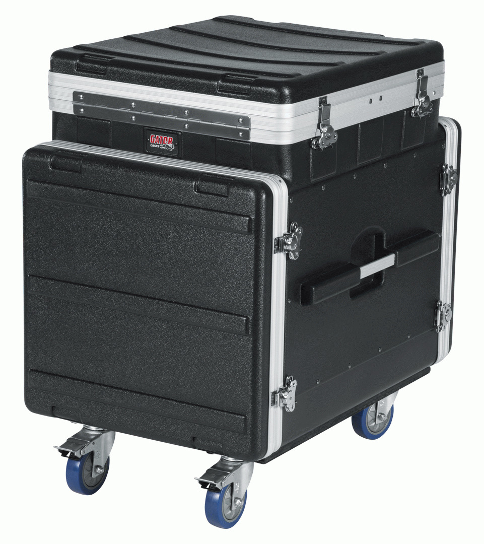 GATOR GRC-12X10 PU MOLDED PE POPUP RACK Gator Cases provides you with the products that protect what's important to you. This is the Gator GRC-12X10 PU. A part of their Pop-Up Console Racks Range. It is a ATA Molded PE Pop-Up Console Rack; 12U Top; 10U Bottom; w/ Casters. Mobile Audio 19 Console Rack with Pop-Up Top-Loaded Rack with High-Density Polyethylene Construction. Features include - Top Rack Uses a Pop-Up Ratchet System for Transporting Flat then Elevating to Various Angles, Threaded rack rail, Side handles for easy lifting to stage or truck, and 4 heavy-duty industrial caster, 2 of which are locking.