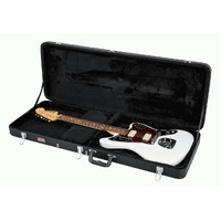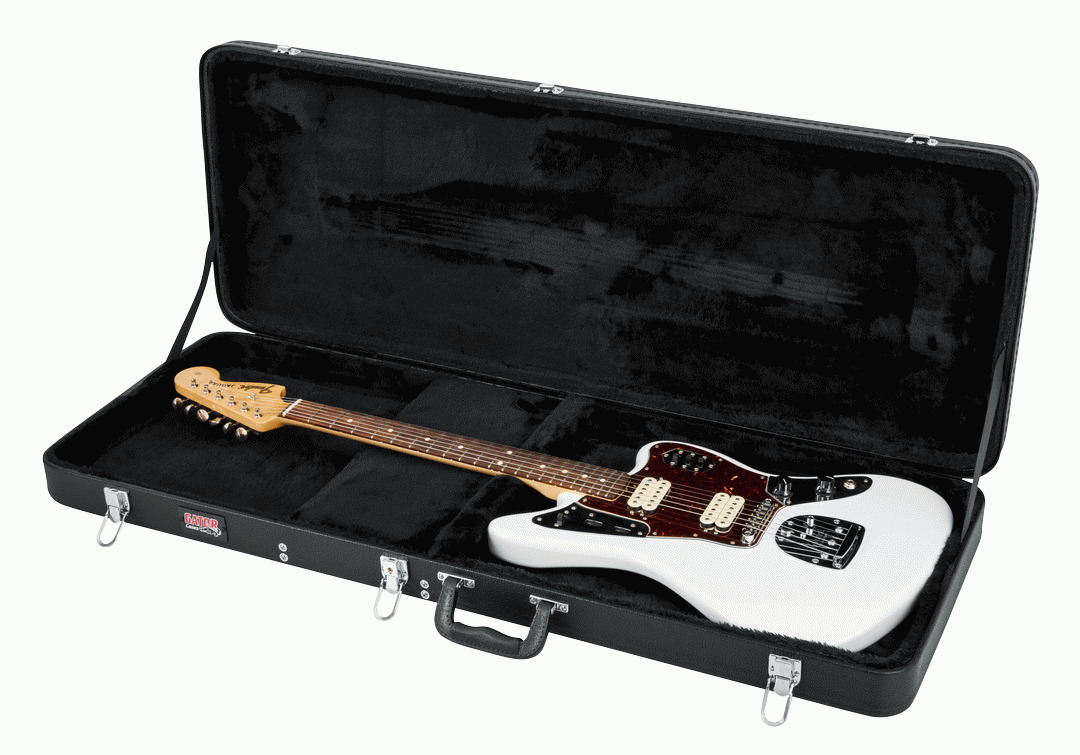 GATOR GWE-JAG GWE HARDSHELL GUITAR CASE The GWE-JAG Hard-Shell Wood Case for Jaguar , Jagmaster and Jazzmaster Style Guitars is lightweight, ultra-slim, and designed to protect against the minor bumps and bruises of daily use. Ultra-durable plywood coated in black Tolex PVC forms a moisture-resistant, impact-resistant outer barrier while plush fabric lining keeps your guitar snug. The large interior storage compartment fits everything from straps and tuners to picks and capos. Chrome plated lockable latches form a secure enclosure and the ergonomic carrying handle perfectly balances the cases weight and gives you a comfy grip on your gear. Keep your guitar safe and sound with the Gator GWE-JAG hard-shell wood case.
