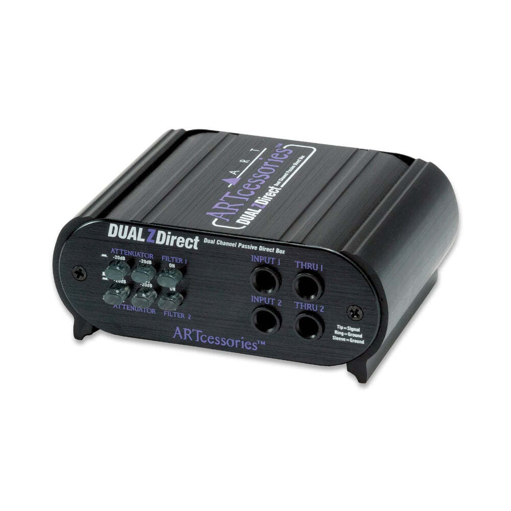 The DUALZDirect provides two independent high quality totally passive interfaces that let you connect instrument, line or speaker-level signals to a mixer or other balanced inputs through high performance audio isolation transformers. Each of the high-impedance single-ended 1/4? inputs is converted by a transformer into an isolated, balanced, low-impedance signal output. Key Features Fully passive, high-performance transformer design. No battery is required. Converts 50k ohm inputs into 600-ohm balanced outputs Switchable input attenuation (0, -20, -40 dB) Switchable low pass filter Switchable phase invert Switchable ground lift (fully isolates inputs from chassis and outputs) Rugged extruded aluminium case The DUALZDirect’s audio transformers have an extremely flat and wide frequency response and can handle high signal levels. This gives the DUALZDirect a very clean and neutral sound with a wide variety of signal sources and over long signal runs in high-noise environments. The input ATTENUATOR switches allow for a wide range of signal levels and the input THRU jacks allows for tapping off of your signal chain. The GROUND LIFT switches let you totally separate the input and output signal grounds, when appropriate, to isolate two systems, thereby reducing hum and ground-loop noise. What further sets the DUALZDirect apart from other “DI” boxes are its extended features and versatility. We have added switchable low-pass FILTERs that cut out all very high frequency interference. These Bessel filters on the outputs are placed out of the audio range and are primarily intended to reduce radio frequency interference before it gets into the main system. The filters are very effective in reducing any digital computer noise artifacts when using the DUALZDirect as an interface between a computer-based audio workstation and your monitors. The PHASE INVERT switches, while not normally included with your “run of the mill” DI box, have been added to allow you to switch signal polarity right at the source. This feature is especially handy when you are combining a direct tap with a microphone feed in the mix. The compact black-anodized all-aluminium case and its passive design allow the DUALZDirect to provide years of trouble-free service in Live Sound, Permanent/Fixed Install, D.J., and virtually any PA application. Its full feature set, rugged construction, and high-end specifications make the DUALZDirect the obvious choice. Specifications Frequency Response 10 Hz – 50 kHz, ± 0.5dB @ +4 dBu Total Harmonic Distortion .01% Typical @ 1 kHz, +18 dBu<.05% @ 100 Hz,+18 dBu Channel Separation > 80 dB (typical) Input Connections 1/4? TRS Unbalanced (2), 50k ? Thru Connections 1/4? TRS (2) Output Connections XLR Male Balanced (2), 600 ? Input Attenuation Switchable, (0 -20, -40dB) Filter Type / Response Switchable, Low Pass, -3 dB @ 30 kHz Dimensions 1.85?H x 4.6?W x 3.9?D (47mm x 117mm x 99mm) Weight 0.88 lbs (0.40 kg)