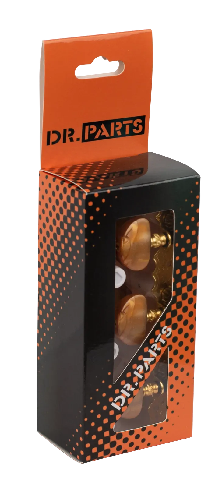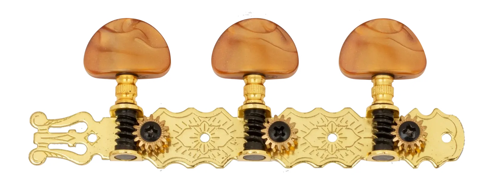 Upgrade your guitar with the Dr Parts 613 Classical Machine Head Set. Designed for both performance and aesthetics, this set features 35mm gold plated tuning pegs that not only enhance the look of your instrument but also ensure reliable tuning stability. Key features include: - 35mm gold plated construction for durability and elegance - Fancy engraved plates that add a stylish touch - Amber-colored buttons for a classic, vintage appearance - 3-a-side configuration for easy installation - 15:1 gear ratio for precise tuning adjustments This machine head set is perfect for guitarists looking to improve their instrument’s functionality while adding a timeless elegance. Enjoy a reliable performance without breaking the bank, as Dr Parts provides quality replacement parts at an affordable price. Each set is conveniently packaged and ships via Australia post parcel service with tracking for a flat rate of $6.95. Orders of $50 or more qualify for free shipping.