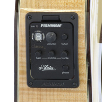 Aria A series offers this beautiful line of classical electric guitars in an affordable price range. The Aria A-48CE is a thin body cutaway classical guitar with a Solid Spruce top and Flamed Maple back and sides. The 14th fret neck joint and 45mm nut width make a playability effortless at higher fret positions. Perfect versatility for any type of players even for non classical guitar players. Equipped with Fishman Classica III preamp system with built-in tuner.