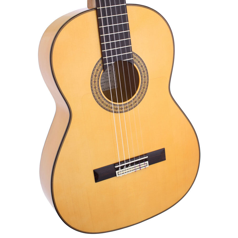Developed personally by our founder Shiro Arai, the AC series features top of the line solid tops handcrafted in Spain. With over 50 years of experience designing classical guitars represents a lifetime dedication to excellence. This Aria AC-70F is a well built, spainish made classical flamenco guitar that is made with nicely chosen tone woods for maximum sound quality. A highly resonant guitar, this AC-70F has all the rich, smooth, mid-range heavy tone required to add body and weight to single note lines. Construction features include laminated Sycamore Back and Sides, a Solid Spruce Top, Mahogany Neck, Rosewood Bridge, Fingerboard and Headstock veneer.