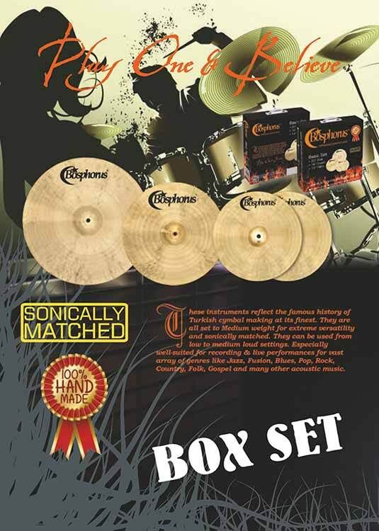 These instruments reflect the famous history of Turkish cymbal making at its finest. They're all set to medium weight for extreme versatility and sonically matched. They can be used from low to medium loud settings. Especially well-suited for recording &